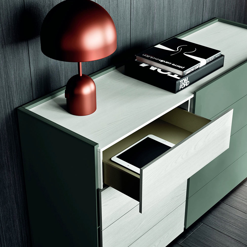 comodă cu 8 sertare în finisaj bicolor, alb și lemn texturat lăcuit mat. conduce. O compoziție pentru mediul de noapte care dă viață unui loc regenerant și rafinat dedicat odihnei, unde finisajele clare și proaspete aduc în minte liniștea interioară. Patul, protagonistul camerei, se caracterizează printr-un