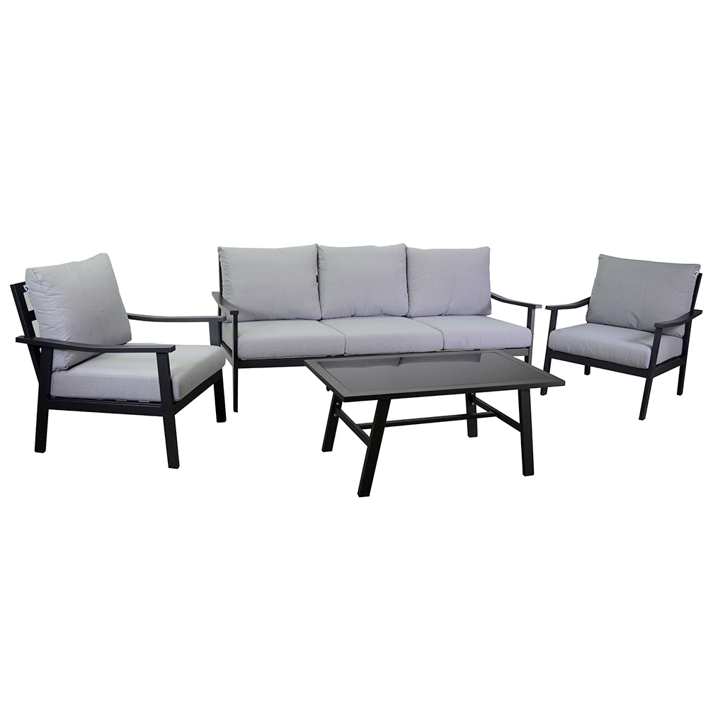 Ansamblul este completat de o masă centrală cu blat din sticlă, perfectă pentru a ține băuturi și gustări, făcând din acest set piesa centrală a oricărei întâlniri sociale în aer liber. Designul minimalist și contemporan al lounge-ului se va integra perfect în orice spațiu exterior, adăugând o notă de stil modern .