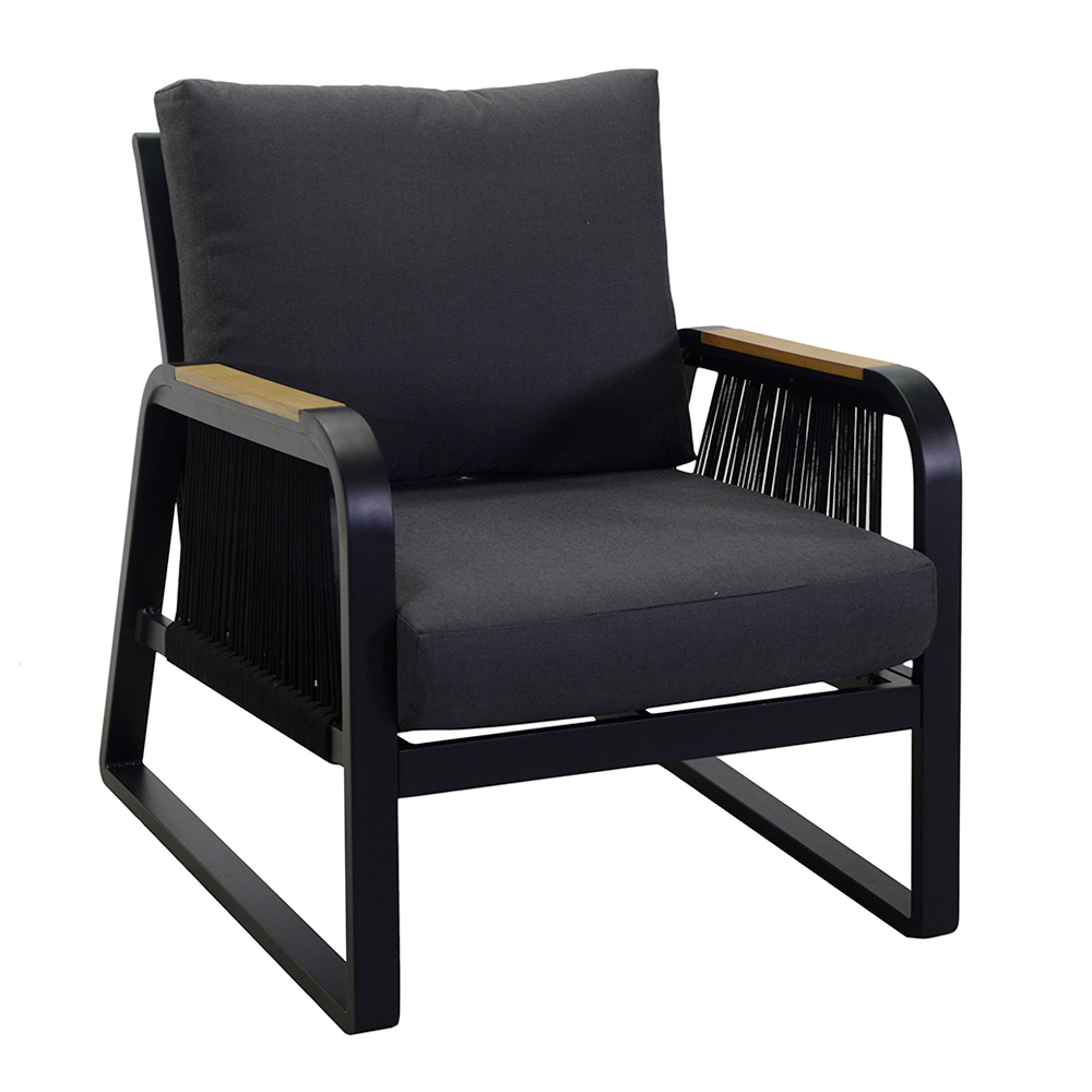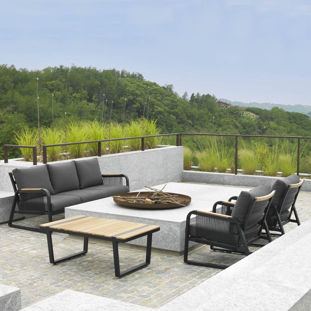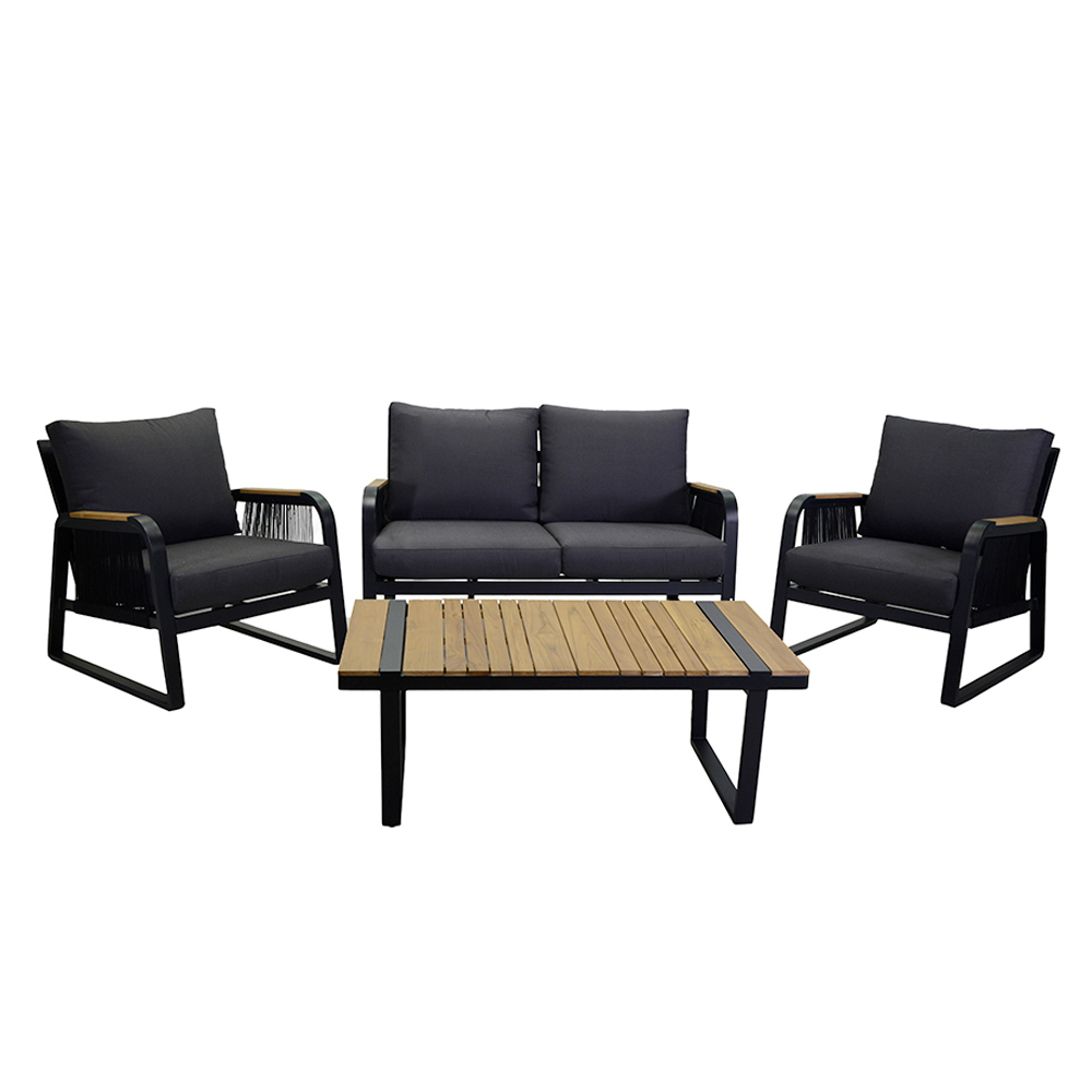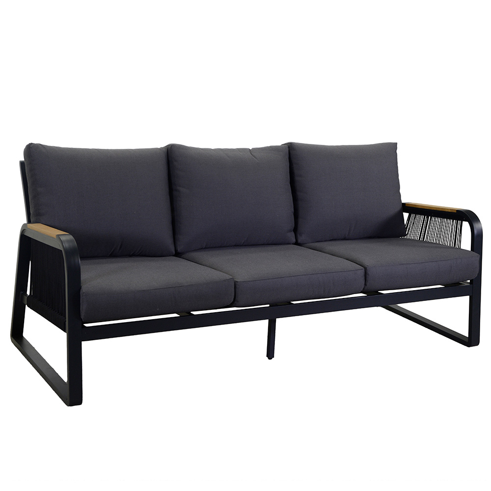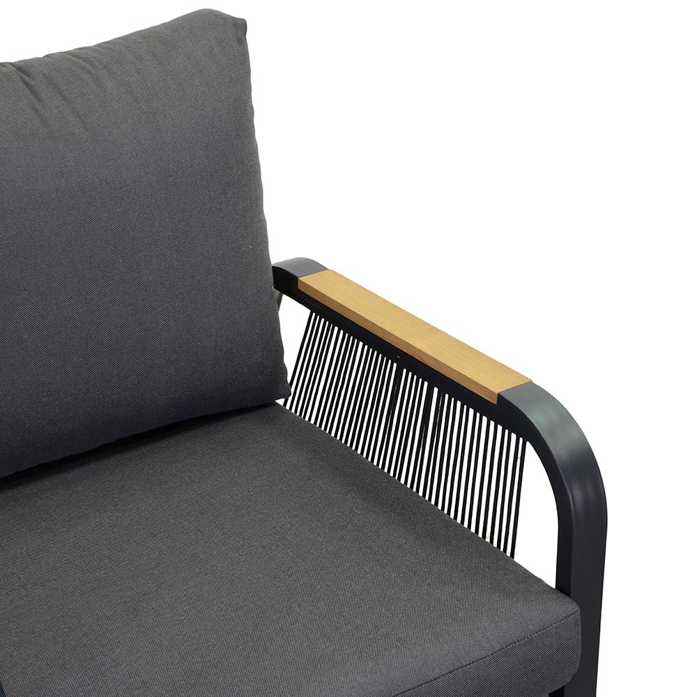 1 canapea: cadru din aluminiu acoperit cu pulbere antirugină de culoare antracit, frânghii din poliester țesut de culoare antracit, perne hidrofobe din poliester gri închis, huse detașabile și cotiere din lemn TEAK din Brazilia