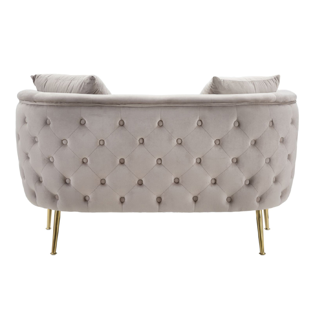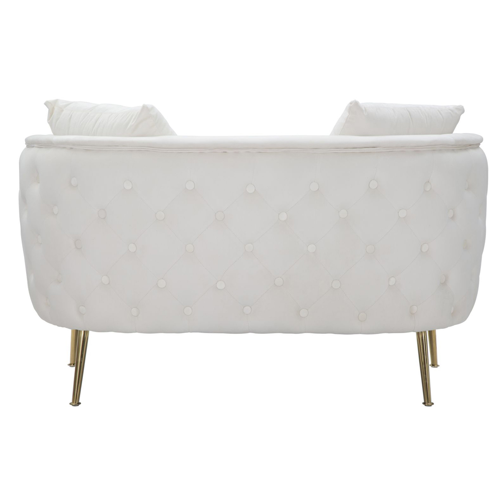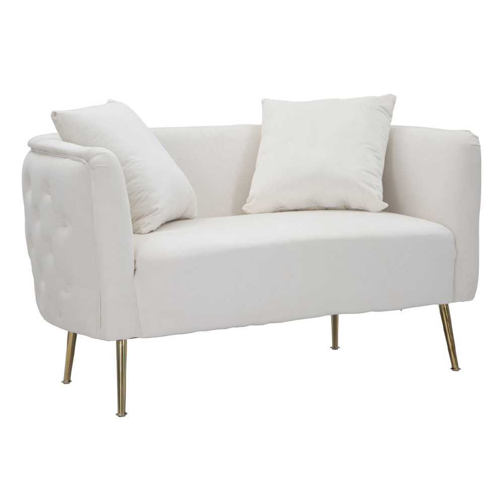 Canapea 2 locuri tapițată și acoperită cu catifea cu picioare de fier aurii.