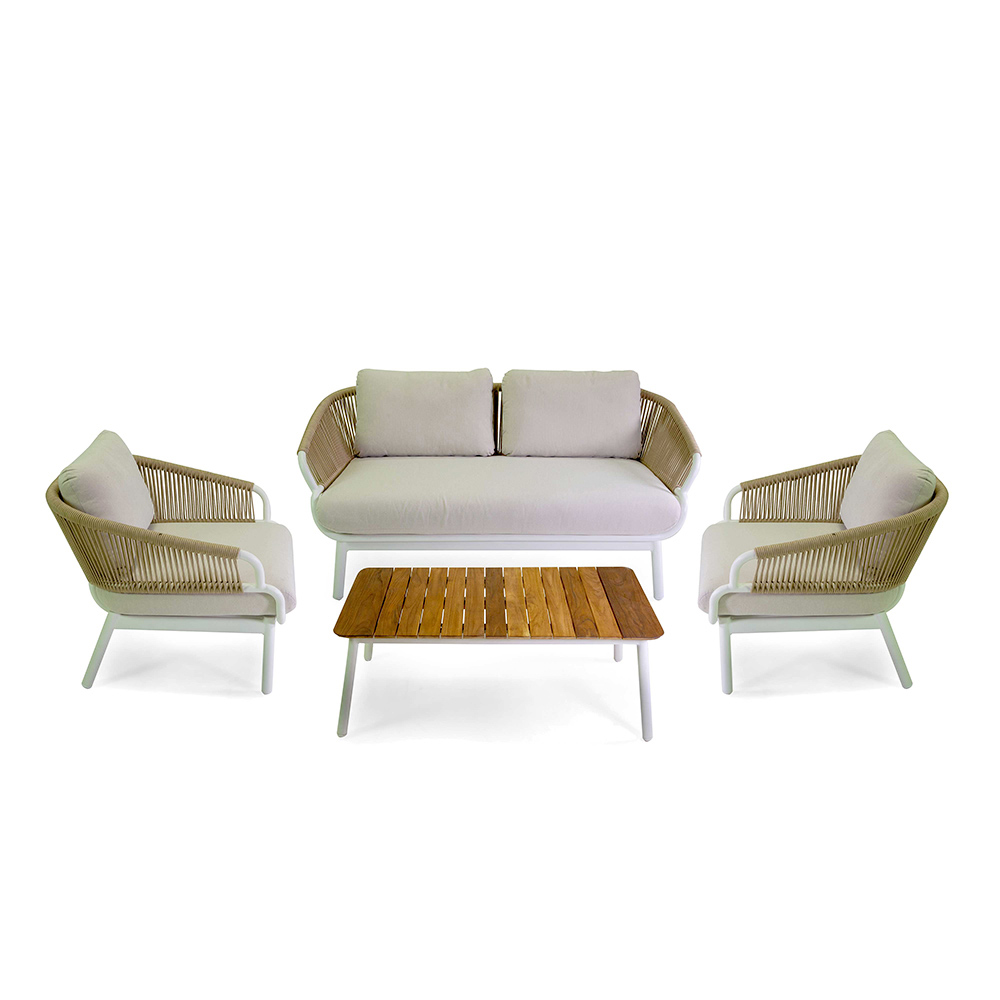 Aduceți prospețimea și eleganța designului modern în spațiul dvs. exterior cu setul nostru garden lounge , perfect pentru cei care doresc să combine style și confort . Acest set este format dintr-o canapea cu trei locuri , două fotolii și o masă de cafea cu blat din lemn de tec , toate având un cadru din aluminiu vopsit în praf alb, care garantează durabilitatea și rezistența la condițiile meteorologice.