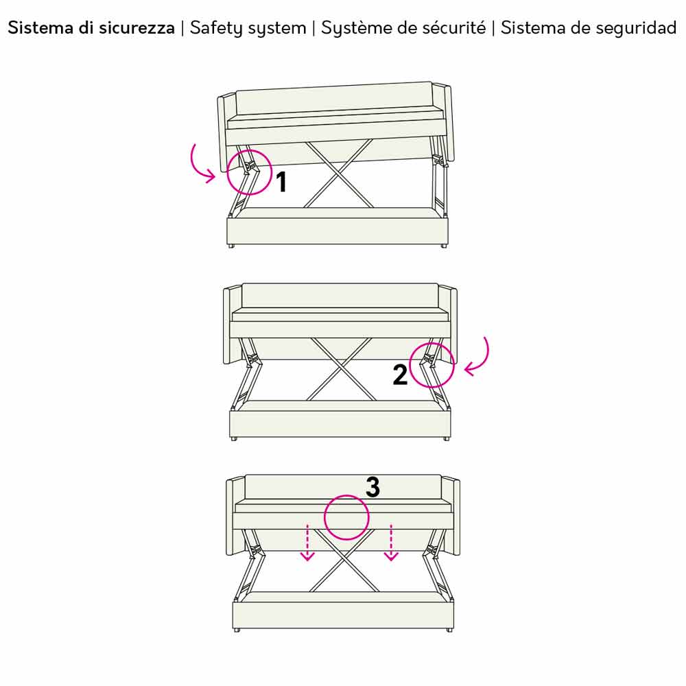mecanismului de deschidere ușoară și rapidă echipat cu 3 niveluri de siguranță, în timp ce pentru a o închide va fi suficient să eliberați cele două suporturi laterale, care vor rămâne blocate până când se va elibera și opritorul central. Canapeaua extensibilă este, de asemenea, echipată cu o scară practică și o șină laterală pentru o garanție și mai mare de siguranță.