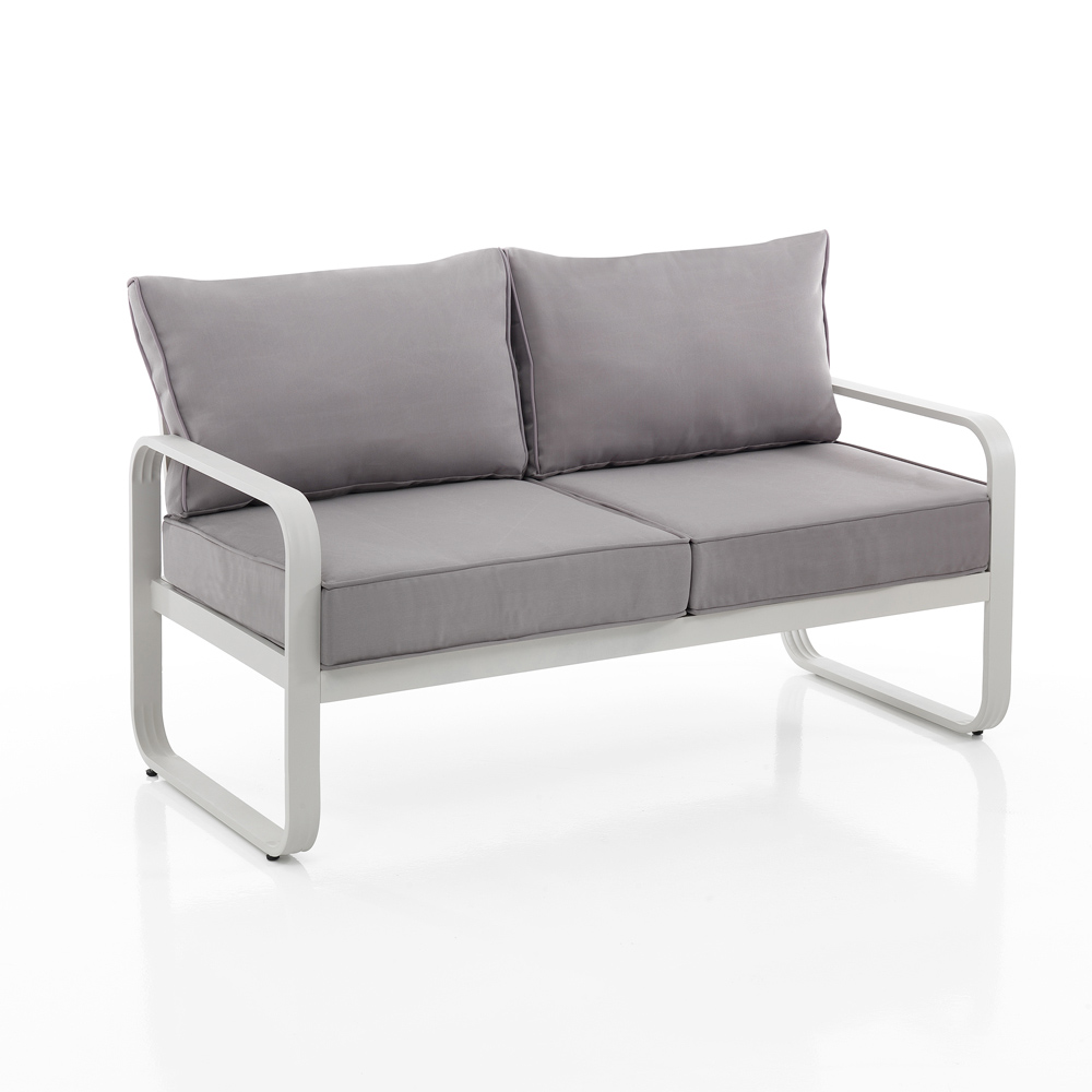 Această canapea cu două locuri este emblema confortului minimalist pentru spațiile exterioare . Liniile sale curate și structura din aluminiu oferă o estetică modernă și captivantă care se adaptează cu versatilitate atât grădinilor moderne, cât și teraselor în stil mai clasic.