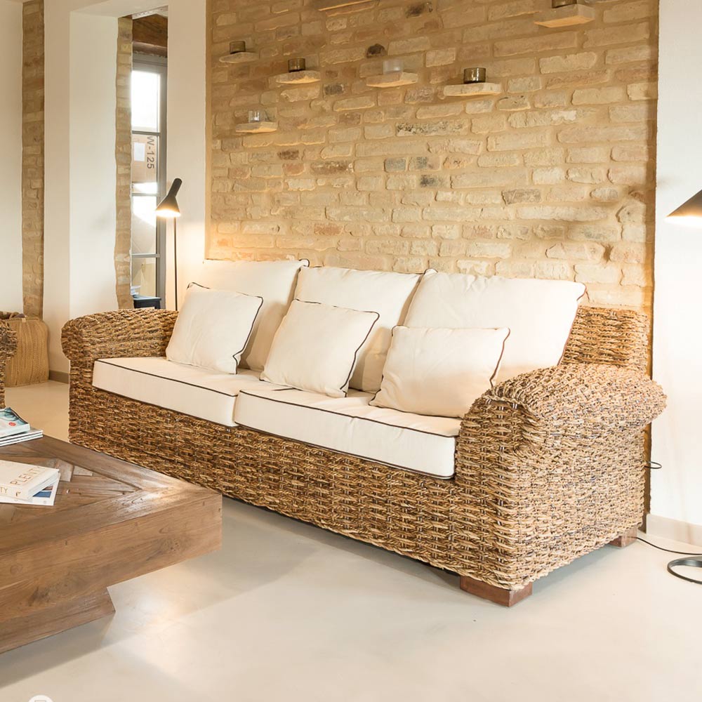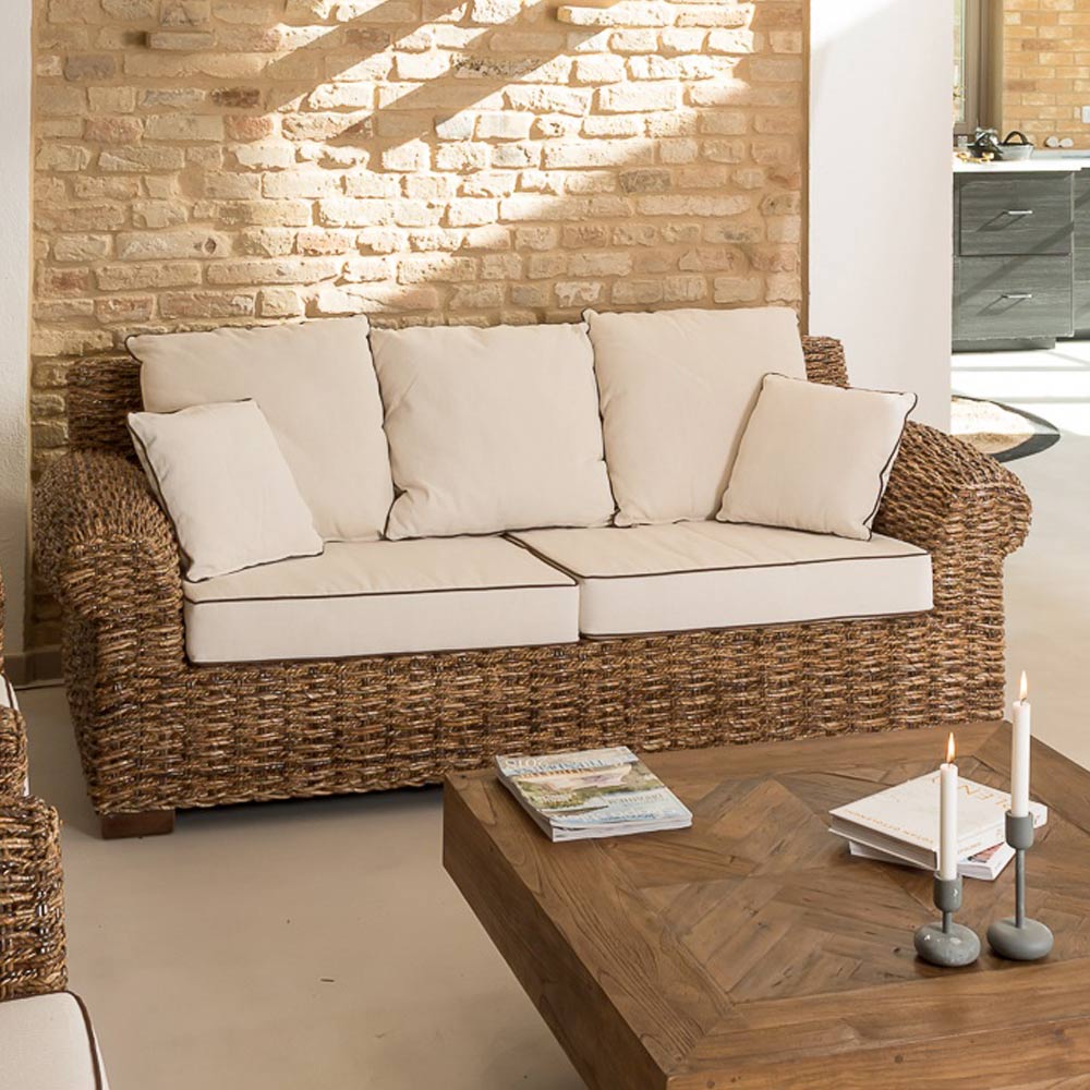 Cafă de exterior cu 2 sau 3 locuri realizată în abaca naturală țesută manual cu perne incluse în finisajul standard " Ecru " și piping " cocolat " .