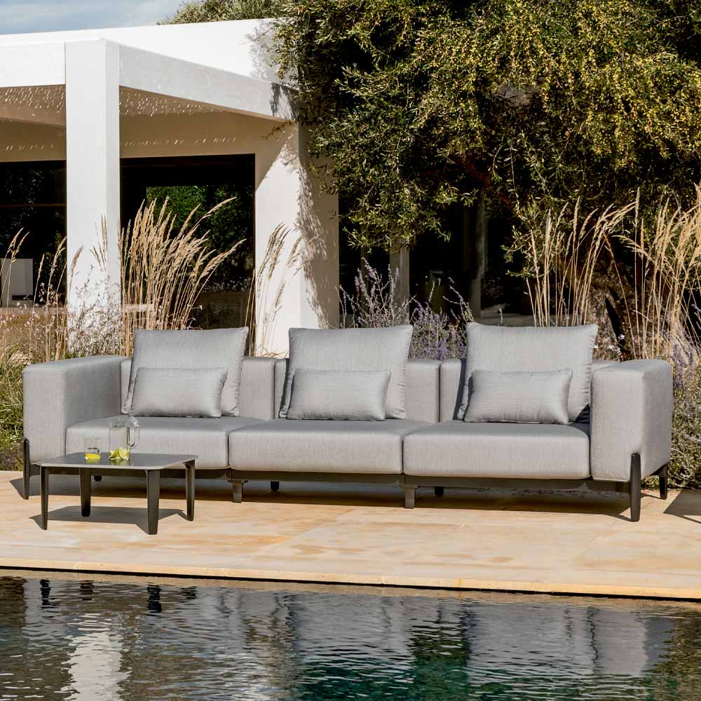 Canapea design exterior de 3 locuri din aluminiu și perne din țesătură impermeabilă, de înaltă calitate, fabricate în Italia.