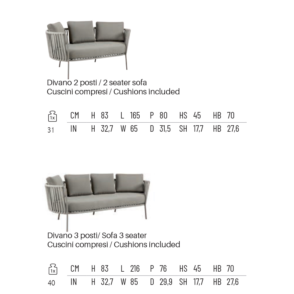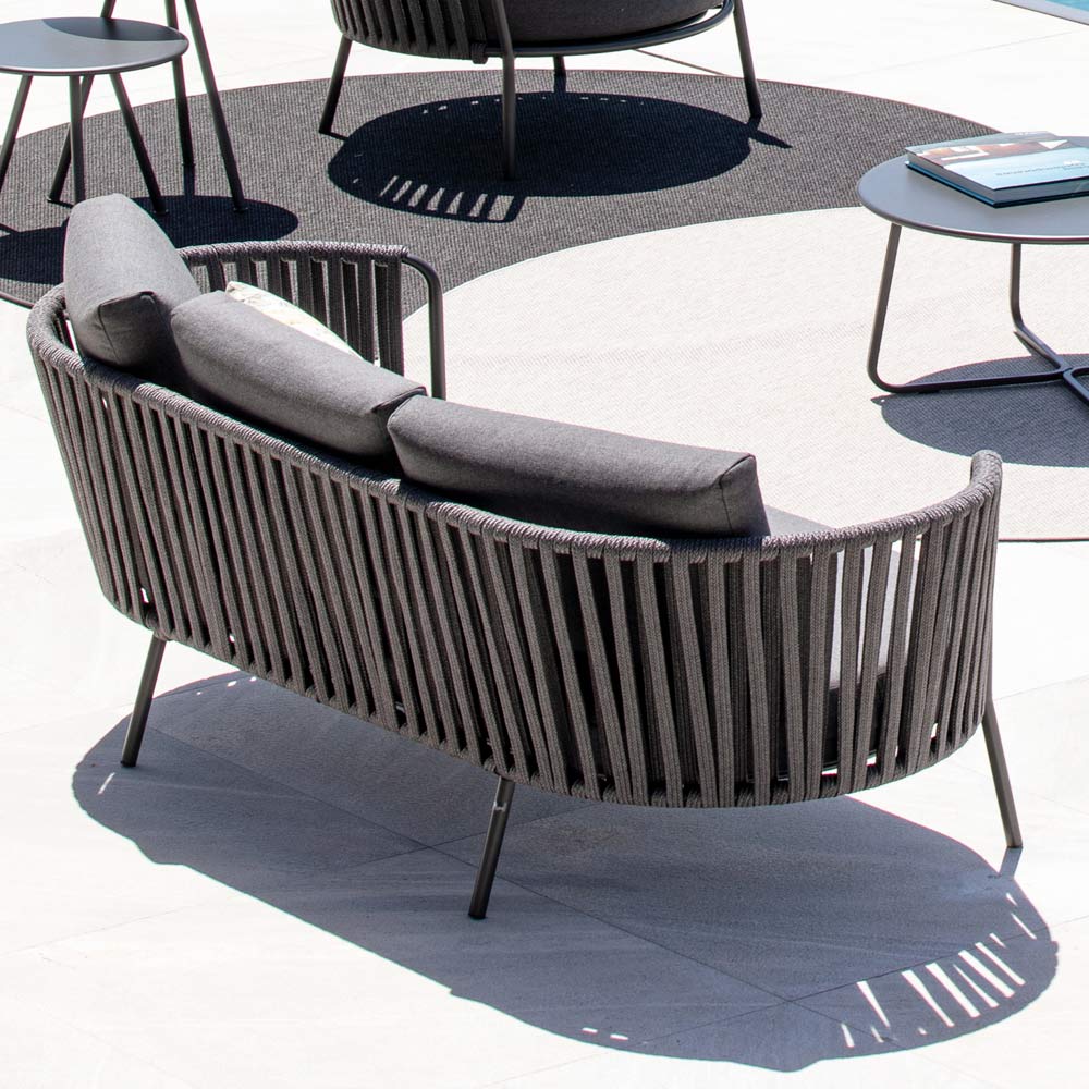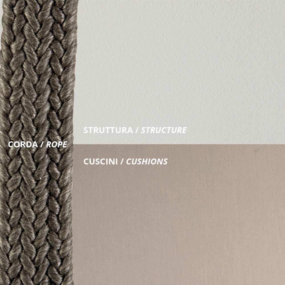 Canapea de exterior din oțel și frânghie de diferite dimensiuni cu perne, fabricată în Italia.