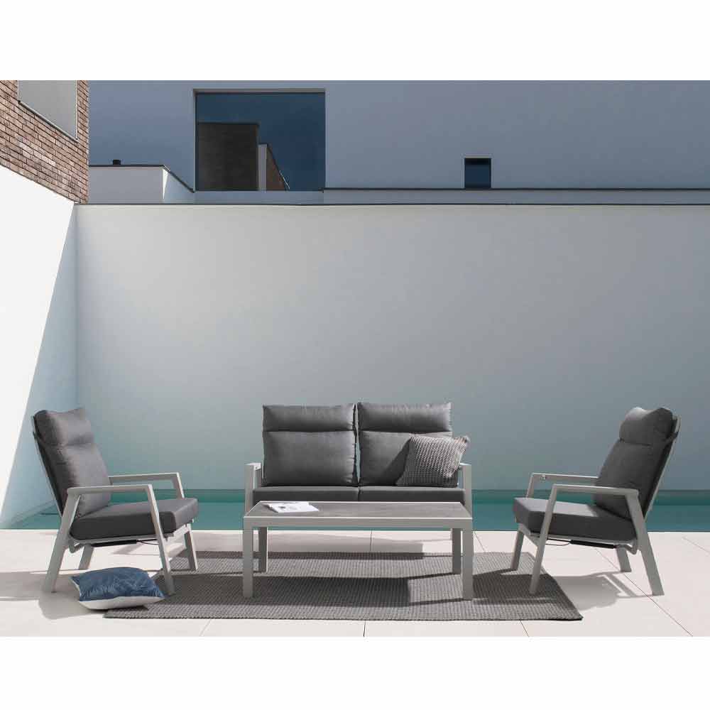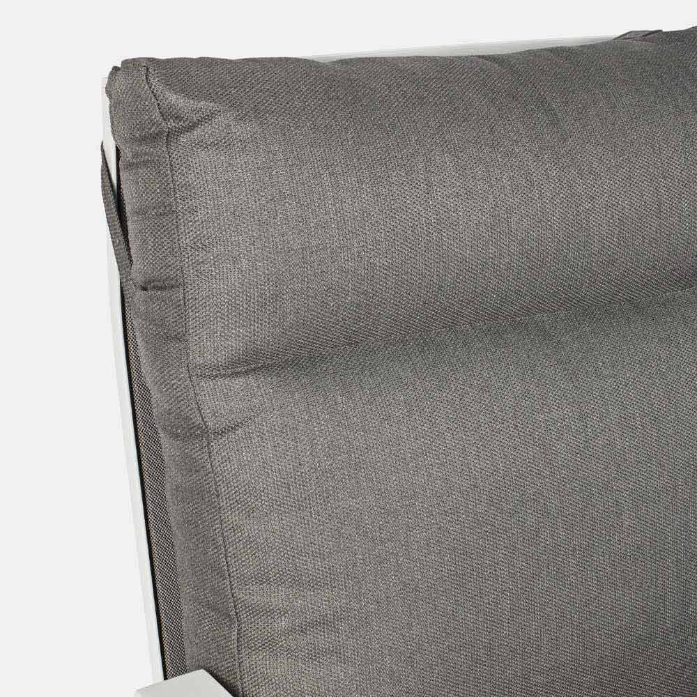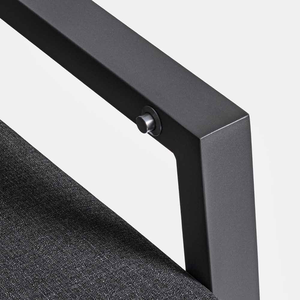 Structură din aluminiu acoperit cu pulbere (poliester). Spătar înclinat în poziție liberă și scaun în textilen 1x1. Perne detașabile cu țesătură olefinică (100% polipropilenă).
