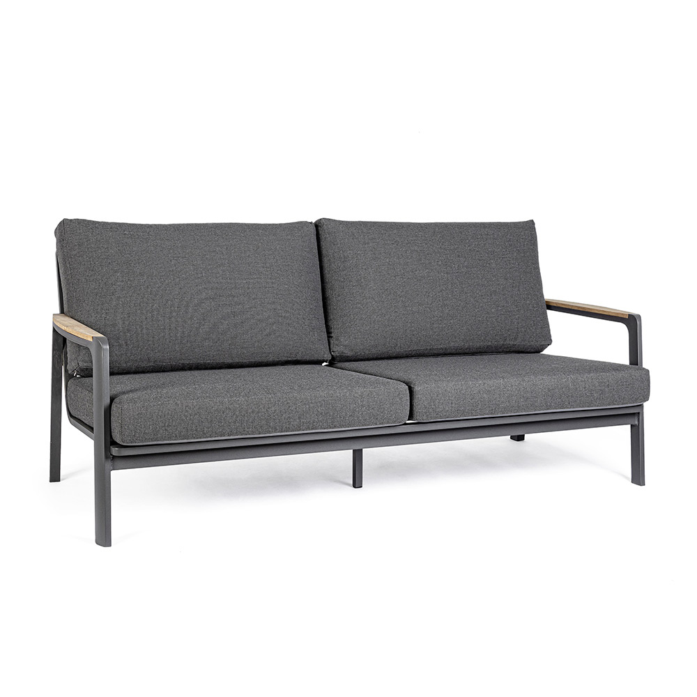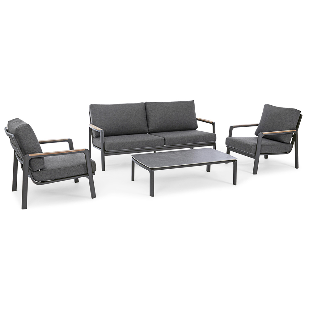 Structură din aluminiu acoperit cu pulbere (poliester). Cotiere cu inserții din tec. Perne pentru șezut și spate cu huse detașabile cu țesătură acrilică.