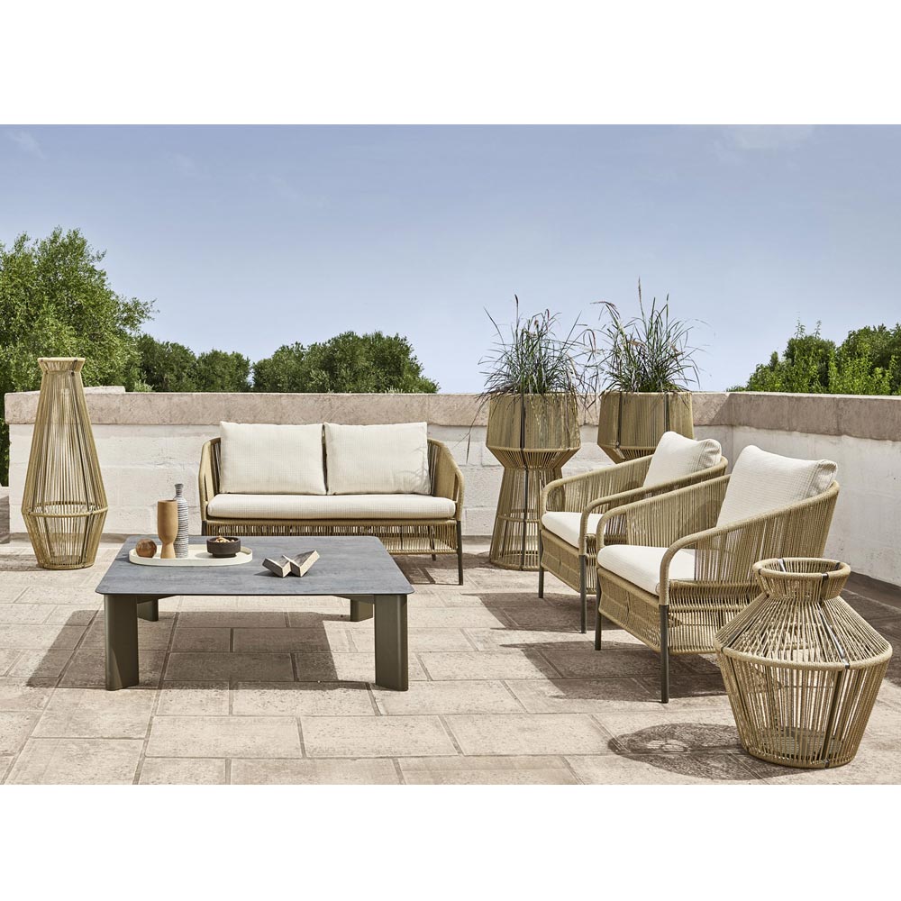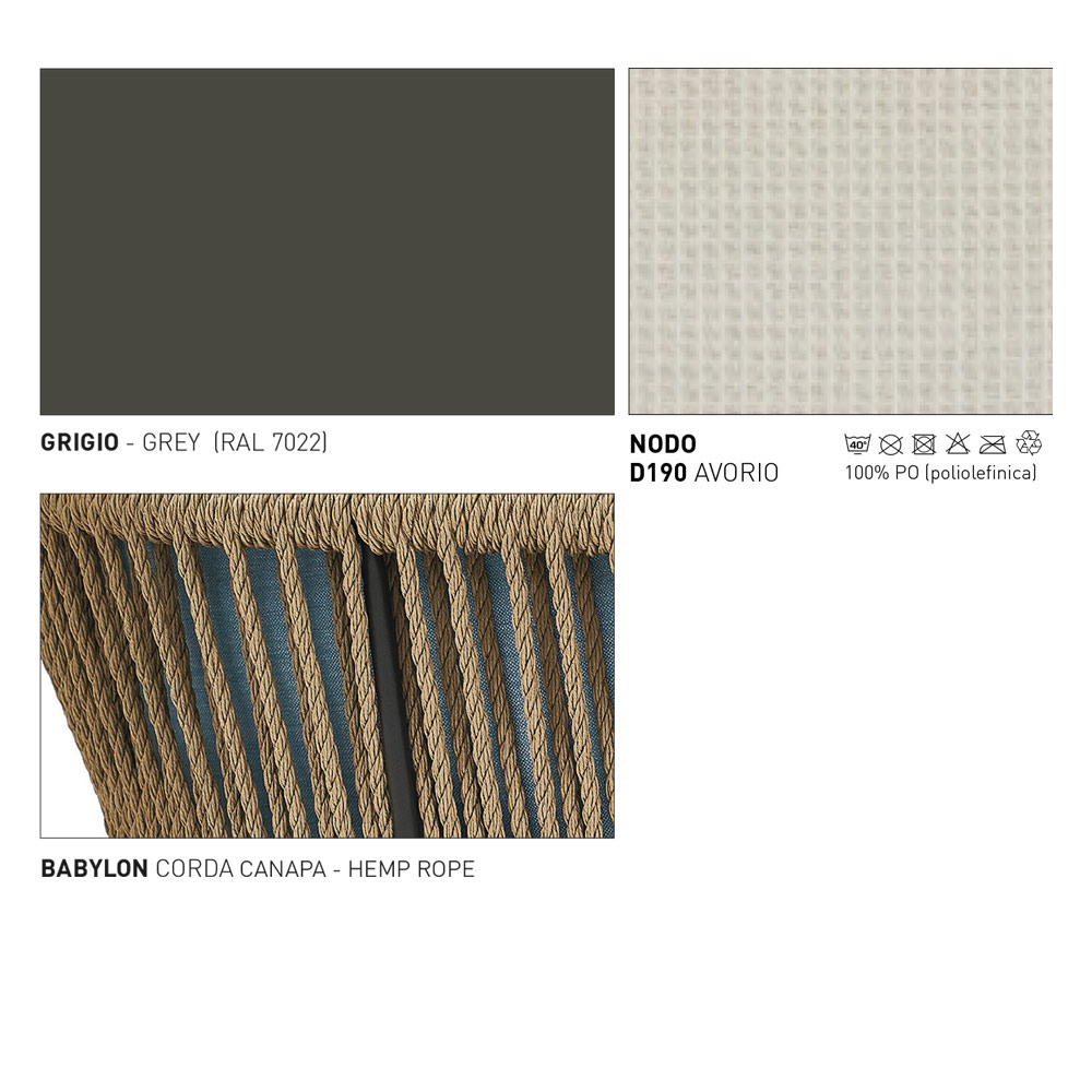 Canapea de grădină cu două locuri cu structură din aluminiu vopsit cu pulbere cu finisaj gri , scaun țesut manual din frânghie de culoarea cânepei și 3 perne ivoire cu umplutură dryfeel incluse. O soluție de amenajare inovatoare și proaspătă, îmbogățită de minunatele finisaje propuse care transformă cu rafinament mediul exterior.