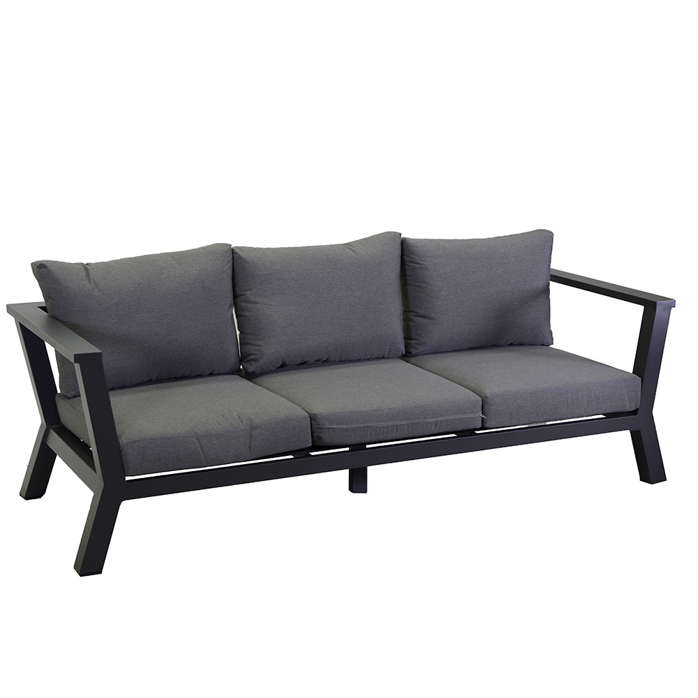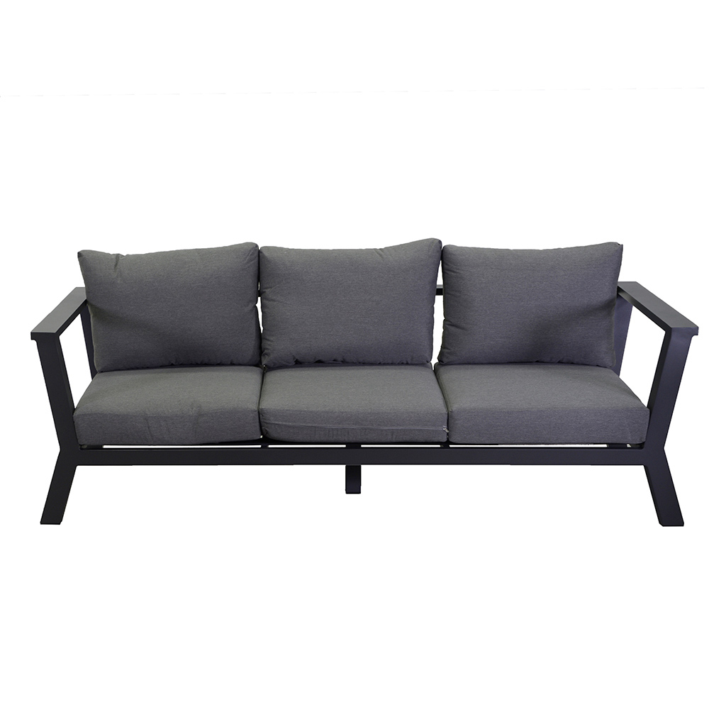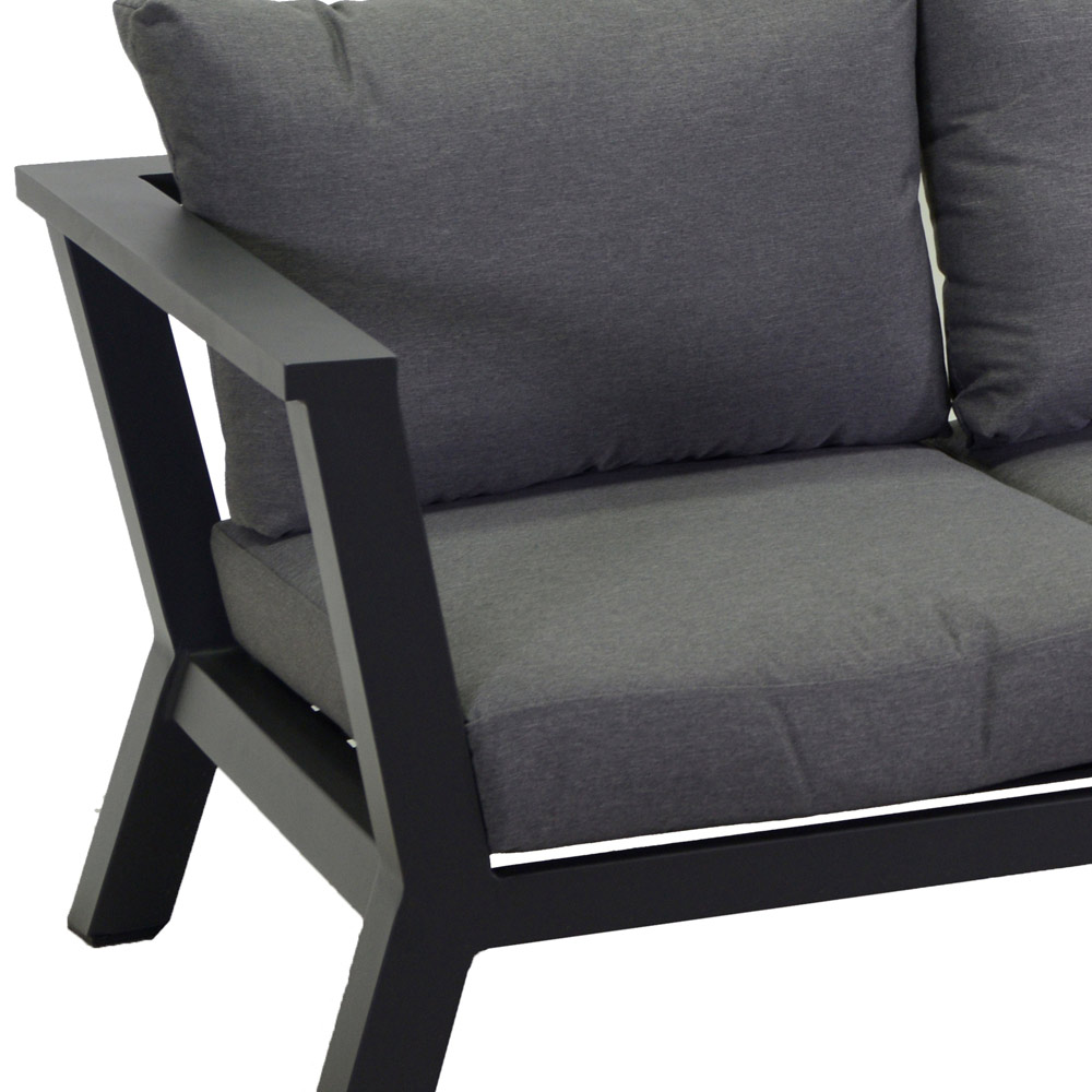 Această canape cu cadru din aluminiu acoperit cu pulbere antracit este întruchiparea eleganței moderne și funcționalității . Perfectă pentru orice spațiu exterior, aceasta oferă un scaun spațios și confortabil, îmbogățit de pernele din țesătură gri, care asigură un confort maxim. Aceste perne, pe lângă faptul că sunt estetice, sunt repelente la apă și inamovibile , asigurând o întreținere ușoară și o durată lungă de viață.