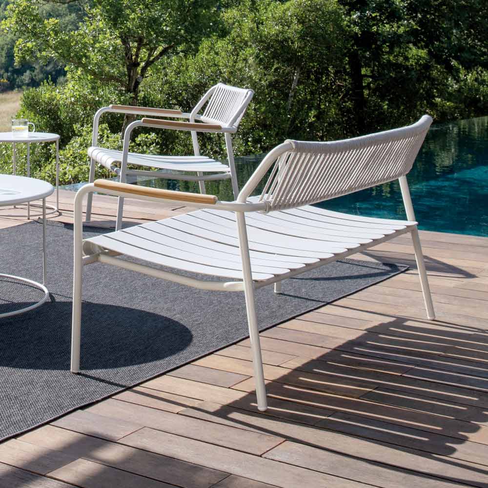 Această canapea de exterior din aluminiu este alegerea ideală pentru cei care își doresc o piesă de mobilier cu un design contemporan și o practicitate maximă. Fabricată cu o structură din aluminiu vopsit în câmp electrostatic , garantează o rezistență excepțională la agenții atmosferici, fiind perfectă pentru utilizare în grădini, terase și medii contractuale, cum ar fi baruri și restaurante în aer liber.