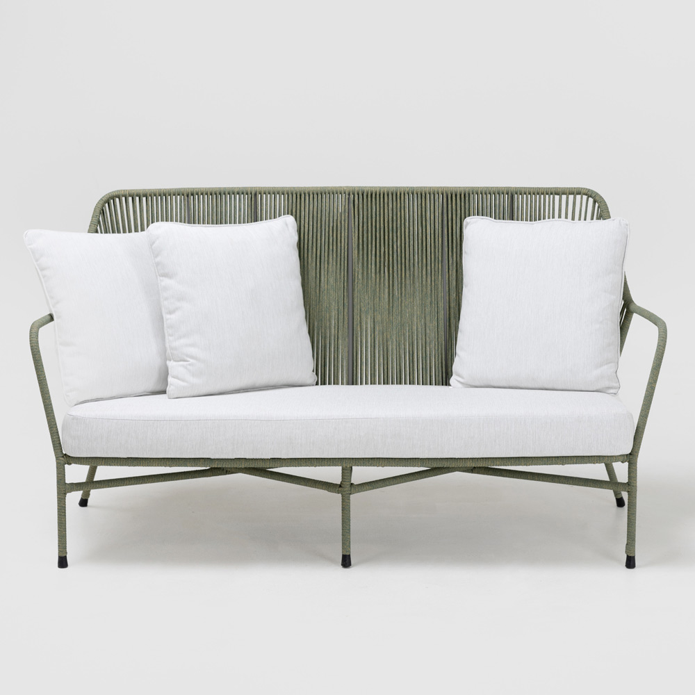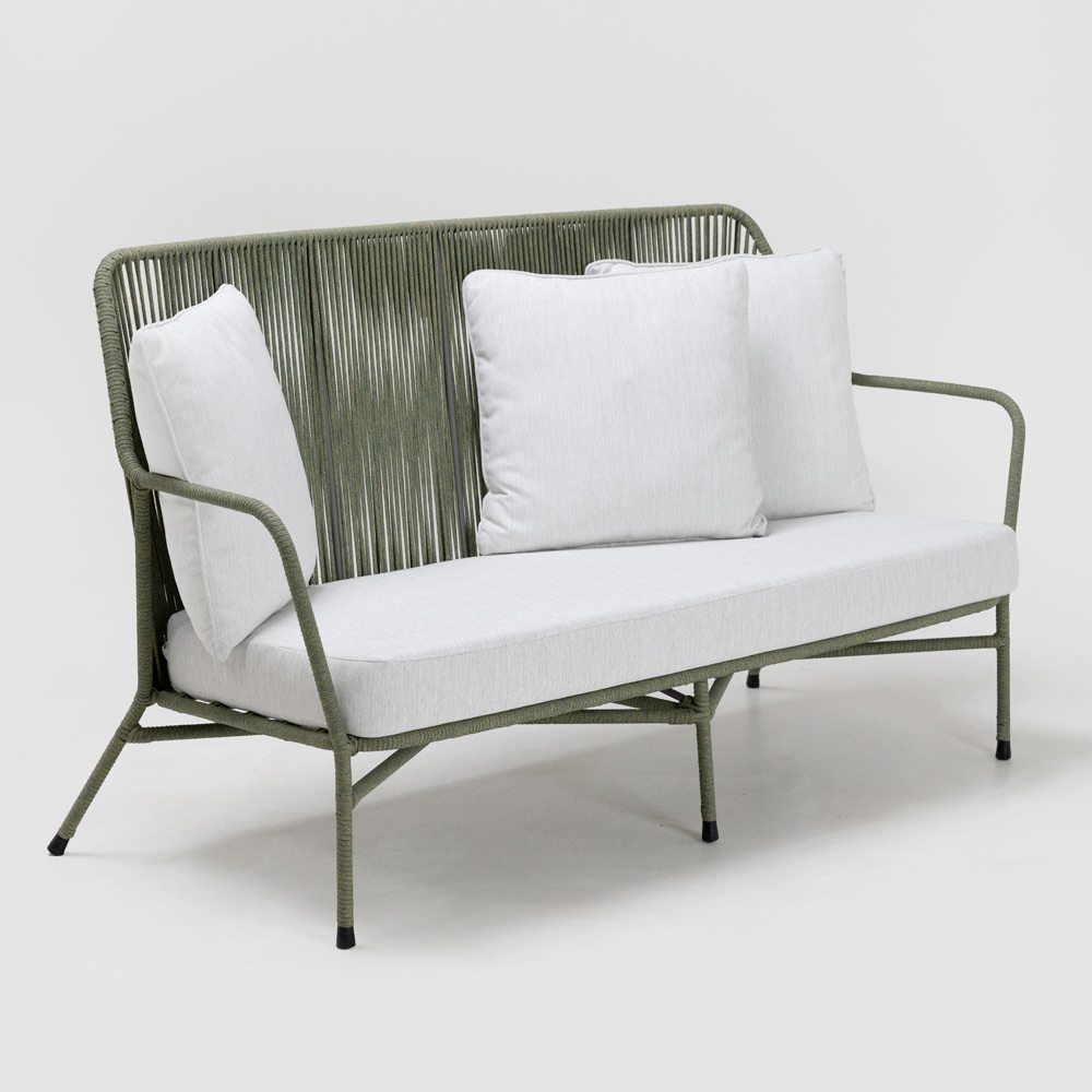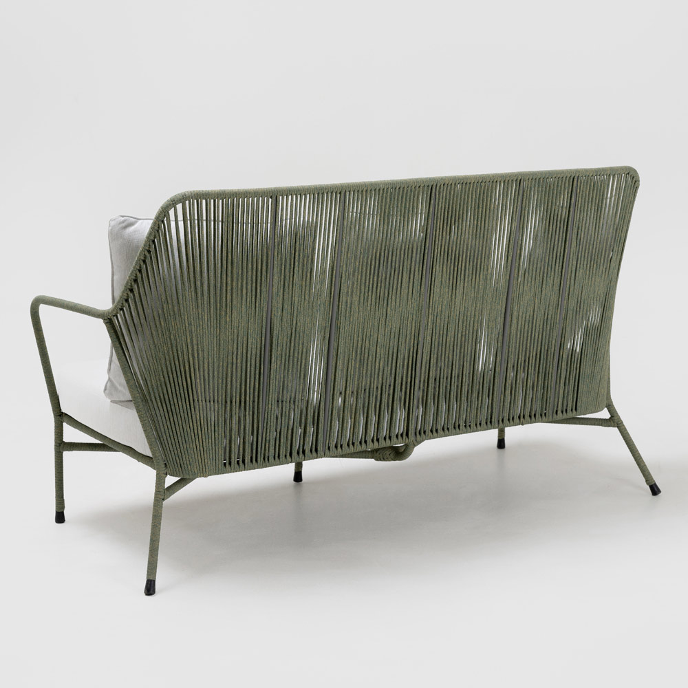 Această canapea de grădină este un paradis al relaxării, ideală pentru a vă bucura de seninătatea din aer liber. Designul său este contemporan, cu o structură light din frânghie țesută care creează un joc de transparență și umbre, adăugând profunzime și interes vizual grădinii sau terasei dvs.