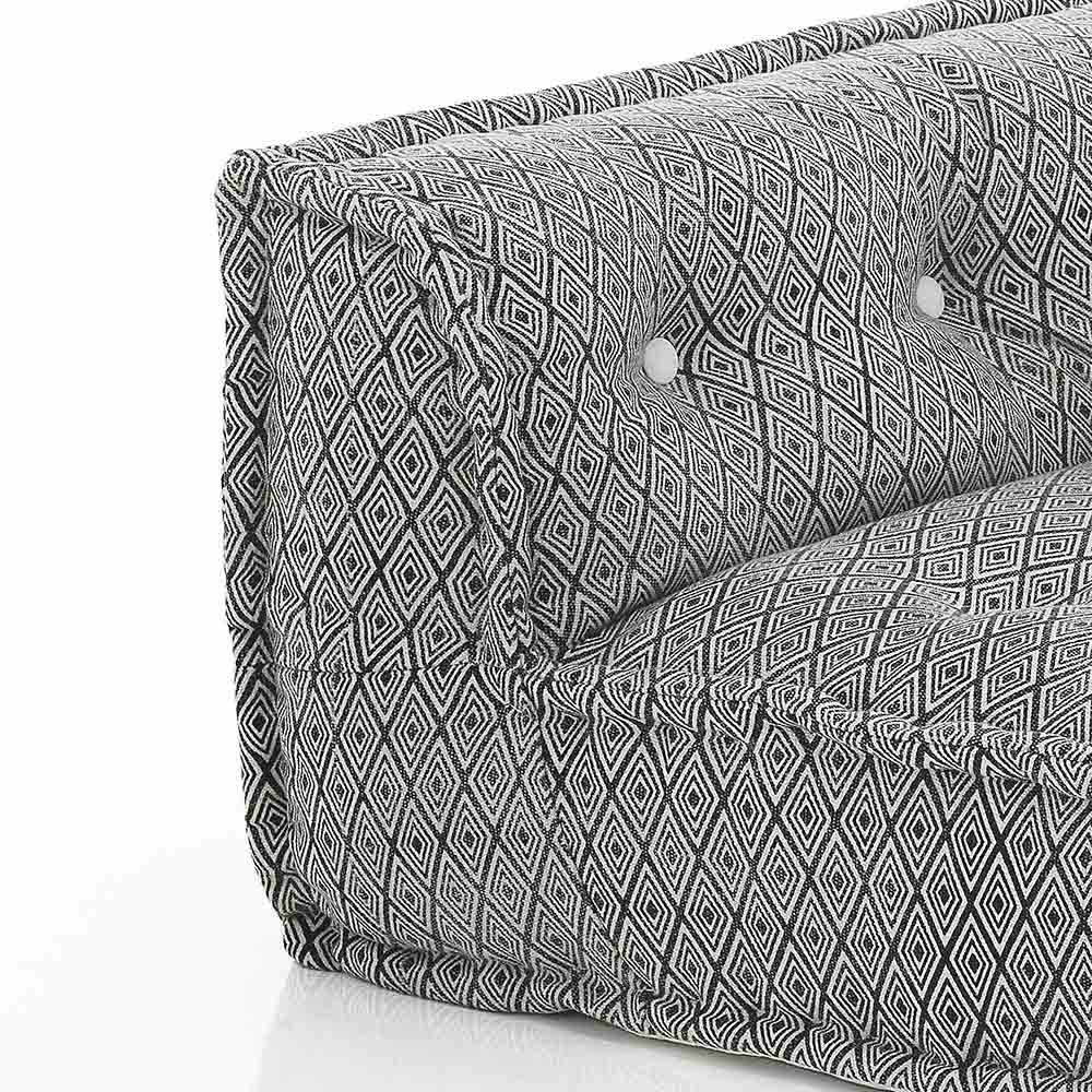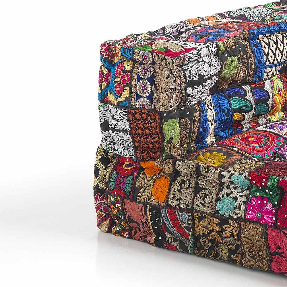 Canapea tapițată din material patchwork și lemn pictat negru sau alb, de design etnic.