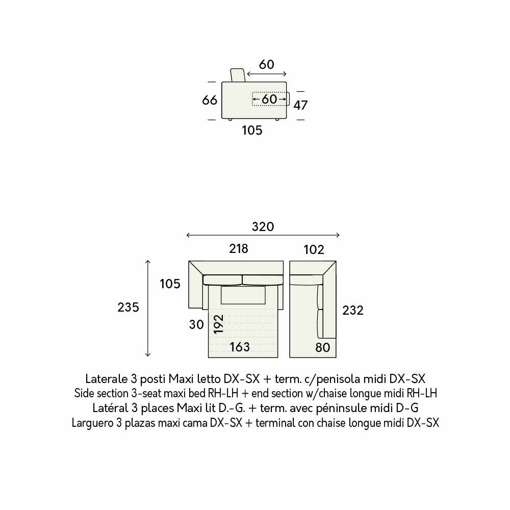 - L 320 x P 235 x H 85 cm (saltea: L 163 x P 192 x H 11 cm).