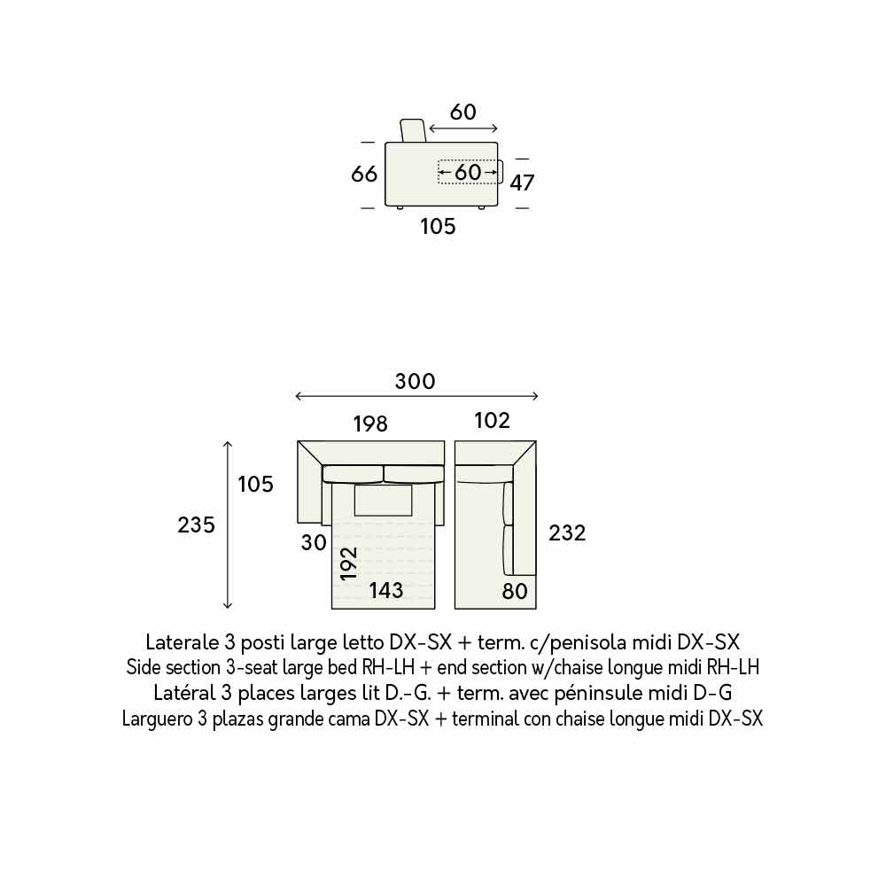 - L 300 x P 235 x H 85 cm (saltea: L 143 x P 192 x H 11 cm):