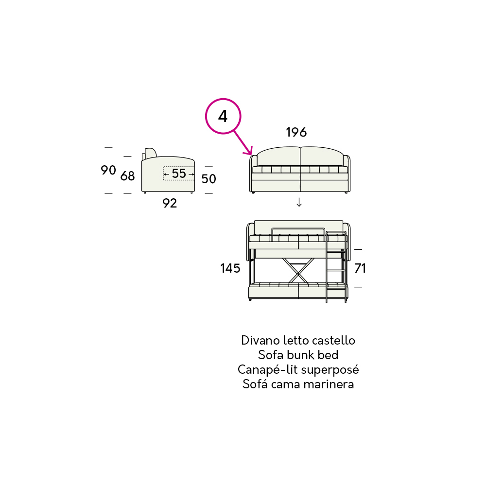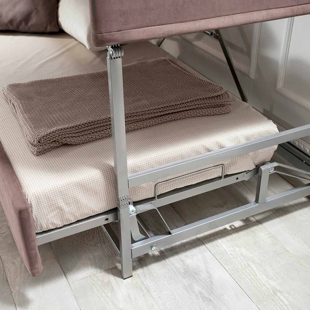 un confort și o liniște maximă datorită sistemului de deschidere cu trei dispozitive de siguranță care transformă patul într-o canapea și invers și rețelei care iese cu 30 cm pentru a facilita și a accelera pregătirea patului inferior. Pentru a o închide din nou, va fi suficient să se elibereze cele două suporturi laterale, care vor rămâne blocate până la eliberarea opritorului central. Canapeaua extensibilă este, de asemenea, echipată cu o scară practică și o șină laterală pentru o garanție și mai mare de siguranță.