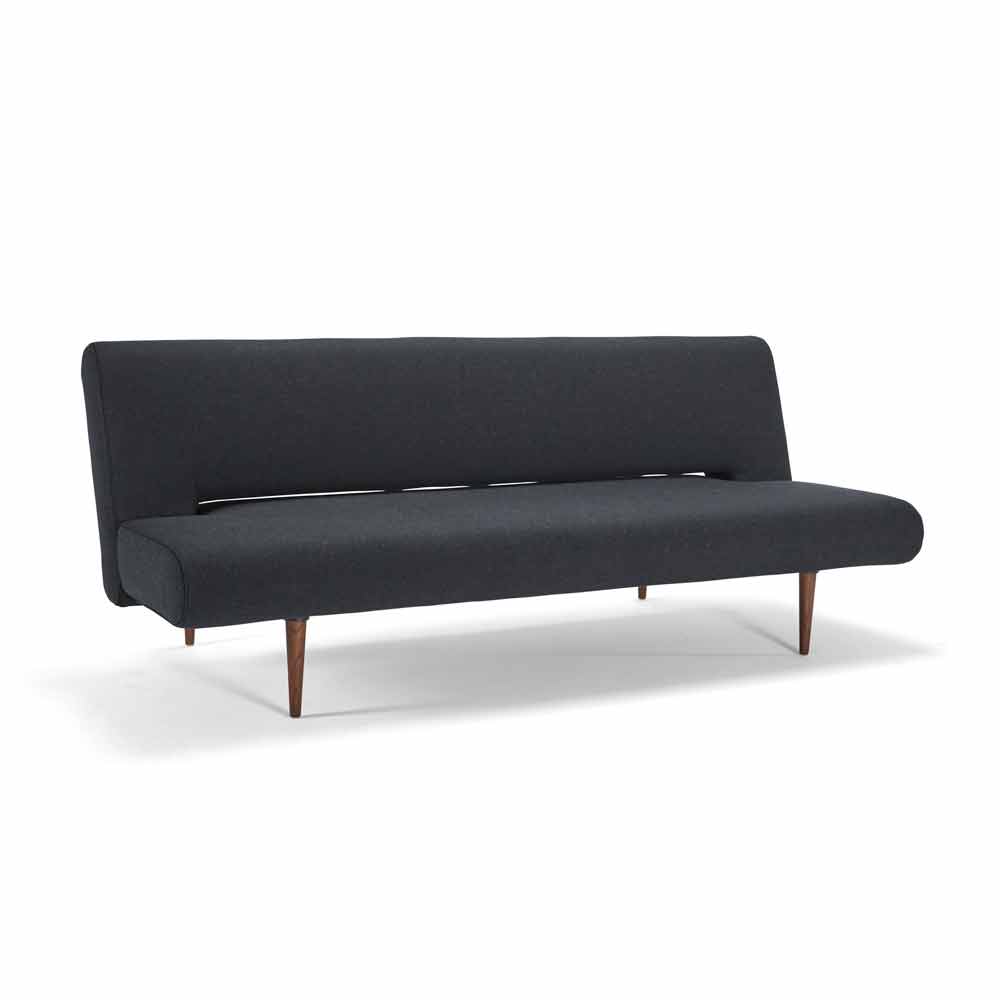 Unfurl este canapeaua extensibilă care vine cu o structură din oțel negru mat și picioare din lemn pătat de culoare închisă.