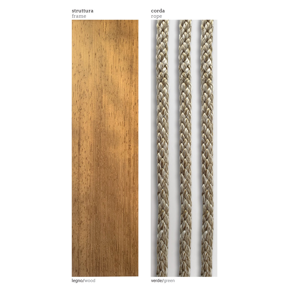 structură din lemn de iroko și țesături de frânghie verde , datorită decorului, amintește de