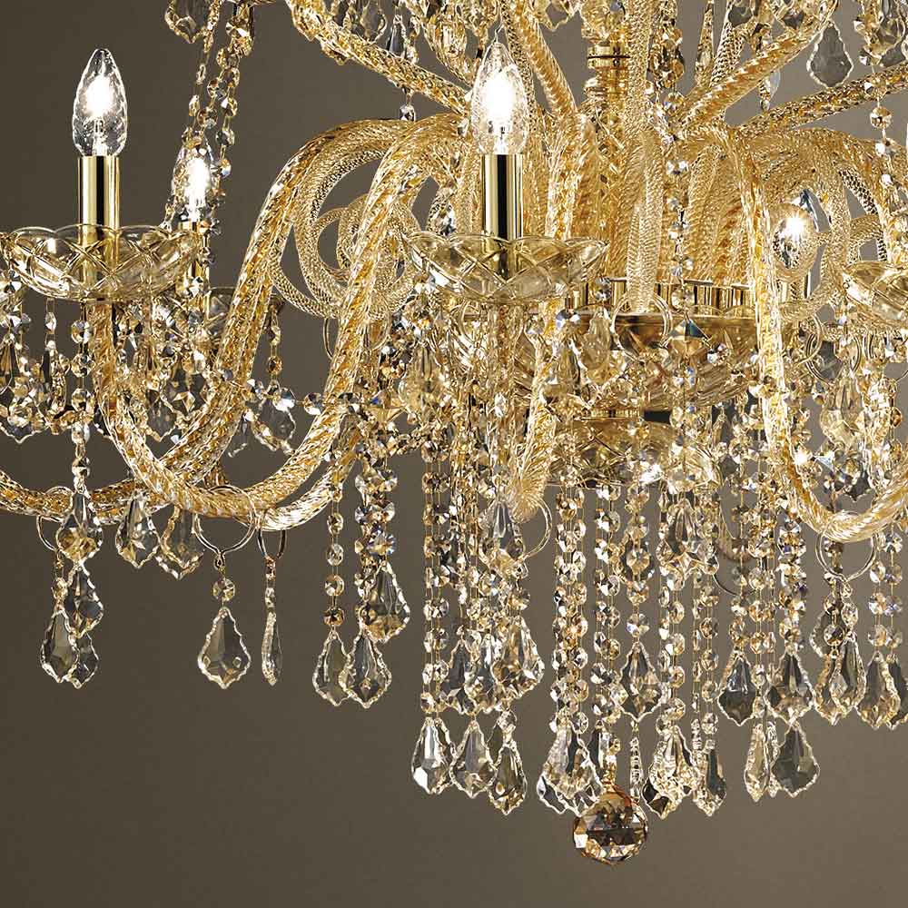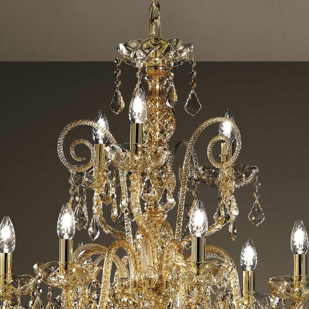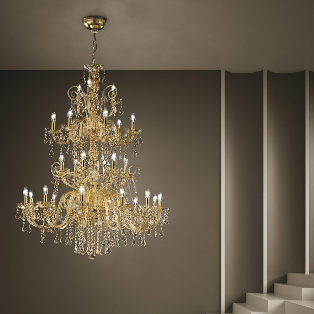 Candelabru cu 27 de lumini din sticla Venetia cu finisaj decor Chihlimbar cu pandantive nationale si detalii in metal auriu lucios . Realizat printr-o măiestrie , acest complement se caracterizează prin minunatele brațe lucrate manual prin tehnica de răsucire care creează un rezultat exclusiv care amintește estetic de împletirea unei frânghii, dând personalitate candelabrului. O adevărată ploaie de lumină invadează structura lustrei și apoi se răspândește în mediul înconjurător prin intermediul refracției prin magia paietelor și pandantivelor de cristal cu finisaje fine, creând astfel un efect scenografic evocator și oniric capabil să încânte și să surprindă. pentru eleganța și măreția sa.