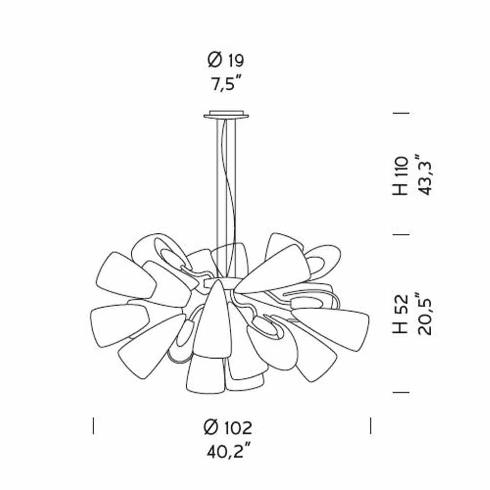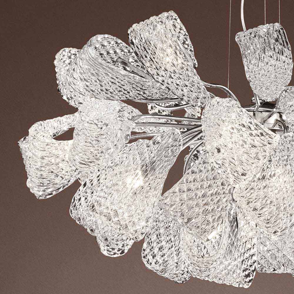 Candelabru impunător și rafinat, cu 21 de lumini, fabricat manual în Italia, din sticlă venețiană finisată cu cristal, cu detalii și inserții din metal cromat lustruit . Din întâlnirea dintre liniile curbate și formele voluminoase se naște un accesoriu de iluminat extrem de rafinat , caracterizat prin arcuri mari de sticlă care îi sporesc valoarea și îi îmbogățesc estetica. Pe ele găsim un model de diamant obținut prin imprimarea texturii pe sticlă în timp ce este fierbinte și permițând astfel luminii să alunece între caneluri, oglindindu-se pe elementele metalice pentru un joc spectaculos de reflexii .