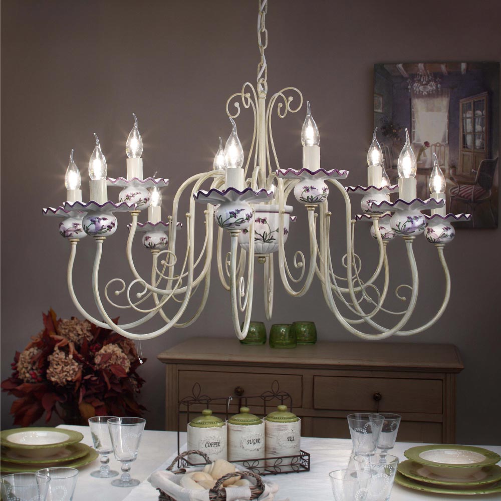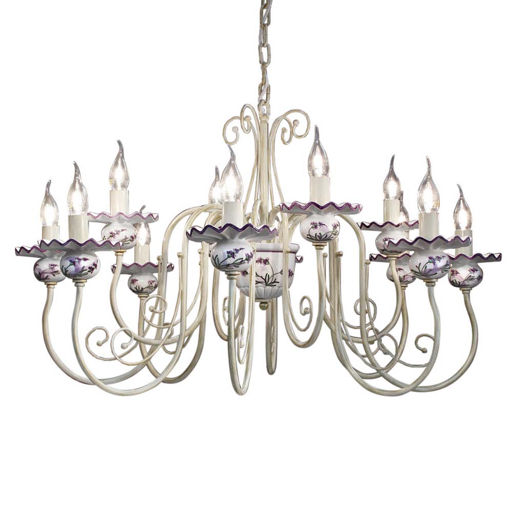 Candelabru realizat manual cu 12 lumini din alama si ceramica pictata manual, realizat in Italia de Ferroluce.