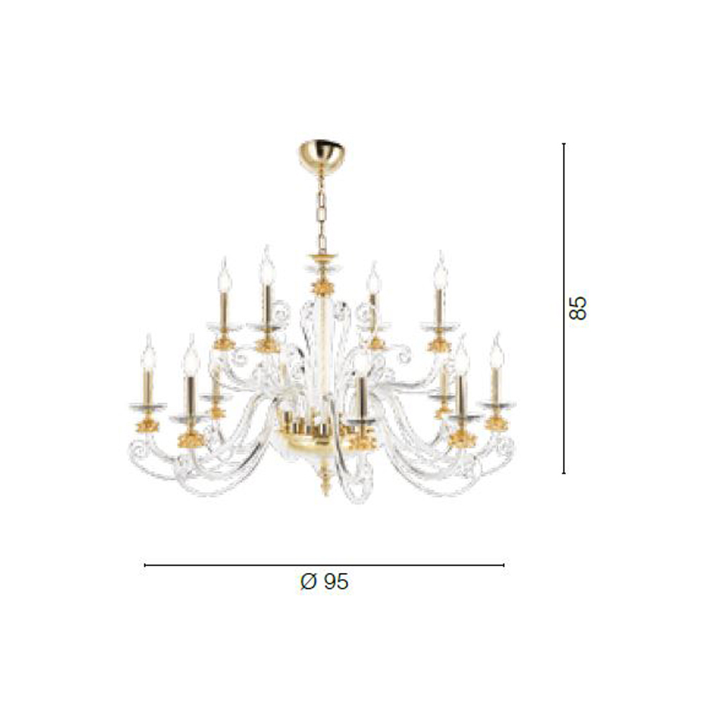 Candelabru cu 12 lumini realizat manual din sticla suflata si cristal optic, de lux fabricat in Italia.