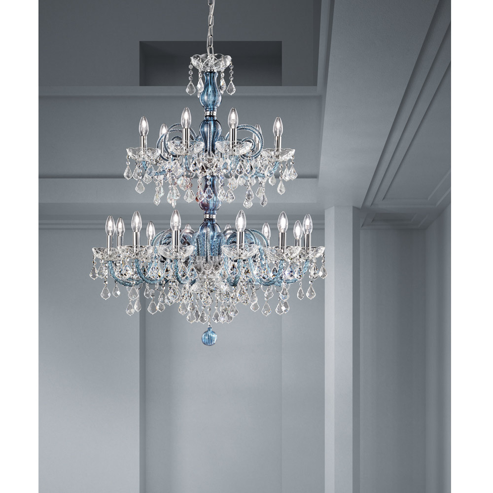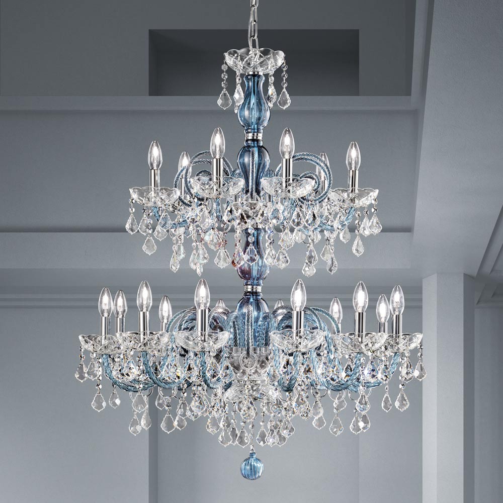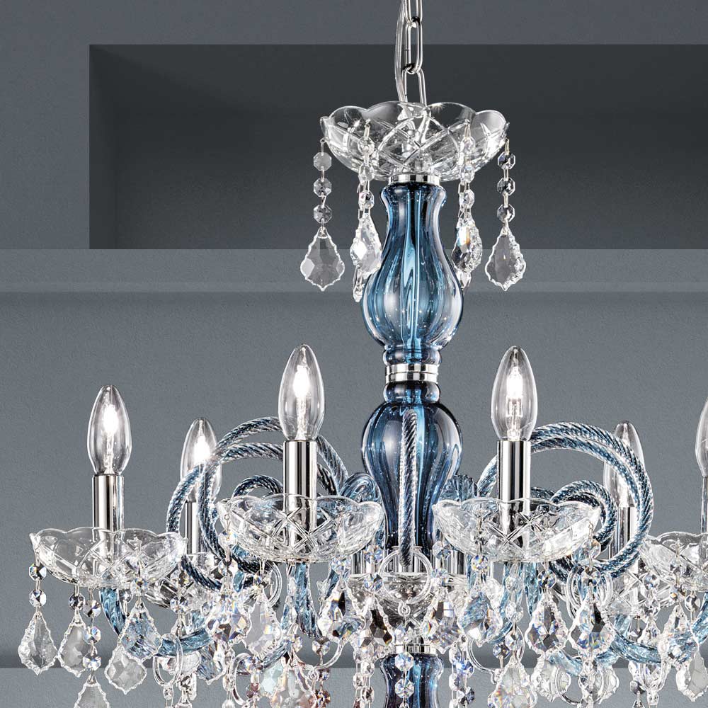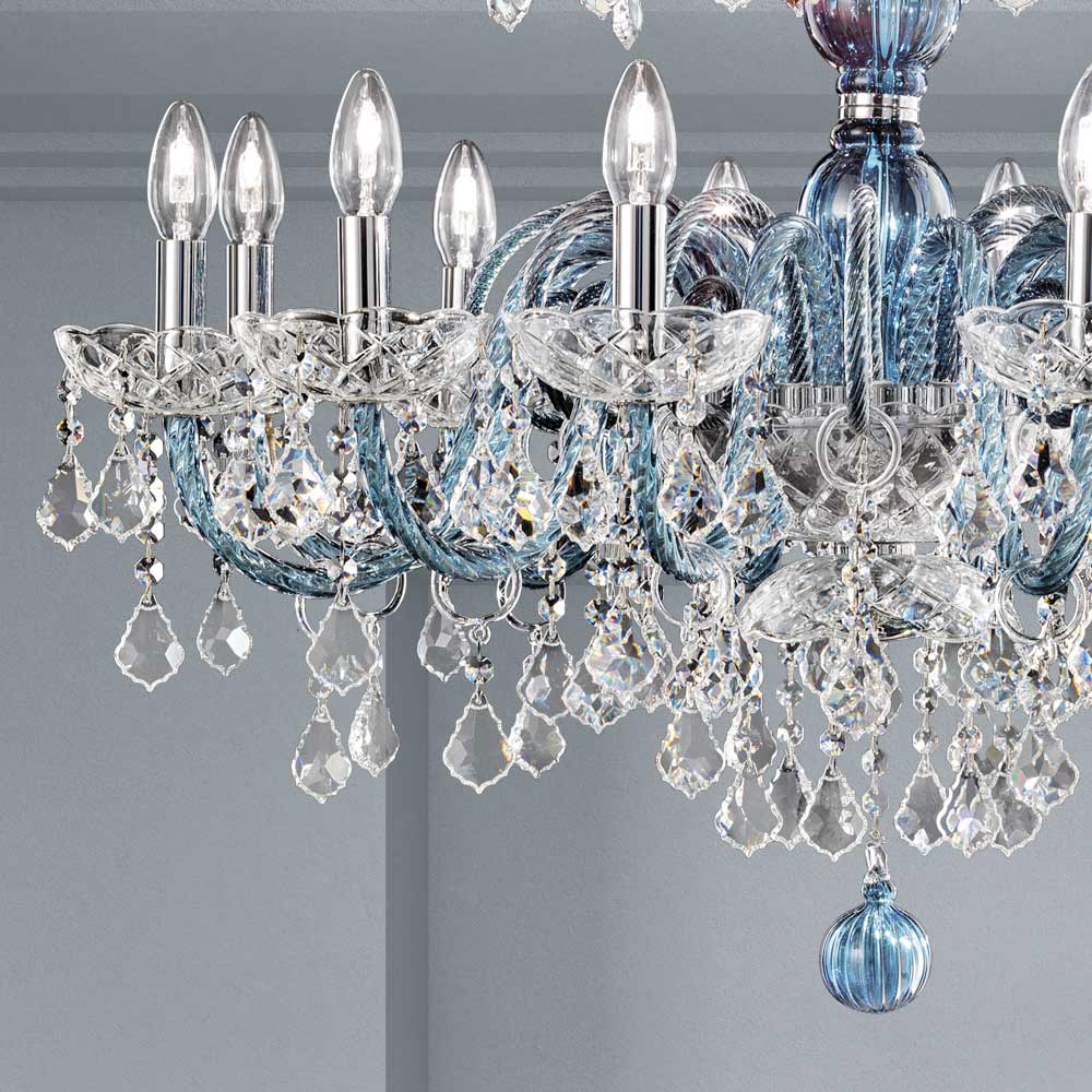 Candelabru cu 18 lumini din sticla Venice cu finisaj denim cu pandantive din plumb si metal cromat lustruit . Realizat printr-o măiestrie , acest complement se caracterizează prin minunatele brațe lucrate manual prin tehnica de răsucire care creează un rezultat exclusiv care amintește estetic de împletirea unei frânghii, dând personalitate candelabrului. O adevărată ploaie de lumină invadează structura lustrei și apoi se răspândește în mediul înconjurător prin intermediul refracției prin magia paietelor și pandantivelor de cristal cu finisaje fine, creând astfel un efect scenografic evocator și oniric capabil să încânte și să surprindă. pentru eleganța și măreția sa.