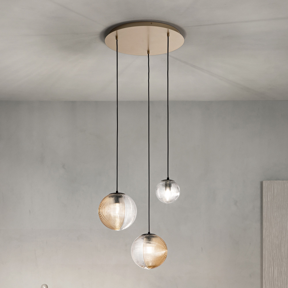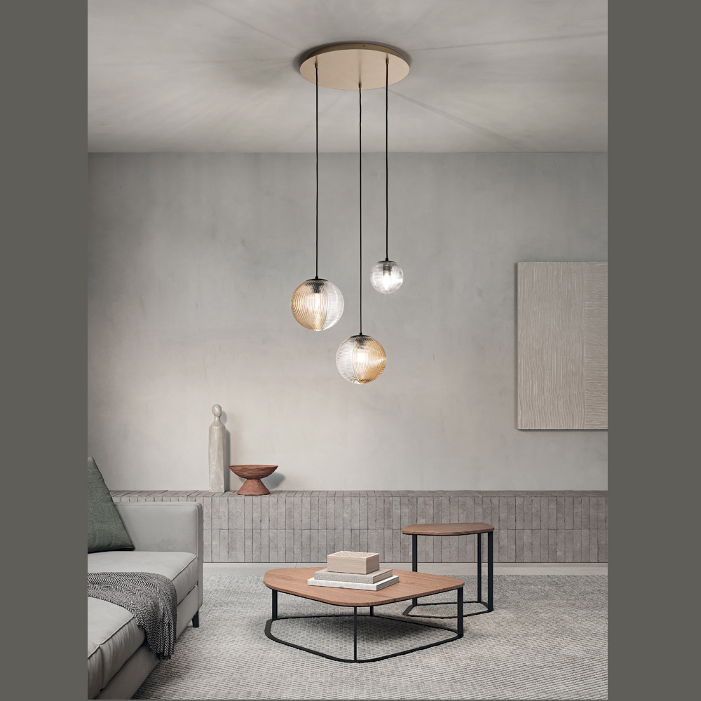 Cufundați-vă într-o atmosferă de eleganță modernă cu acest candelabru cu pandantiv, perfect pentru a adăuga o notă de lux discret oricărui spațiu. Sferele luminoase atârnă într-un dans armonios de lumină și reflexii , fiecare încapsulată în sticlă suflată cu finisaje diferite, reflectând o lumină caldă și primitoare .