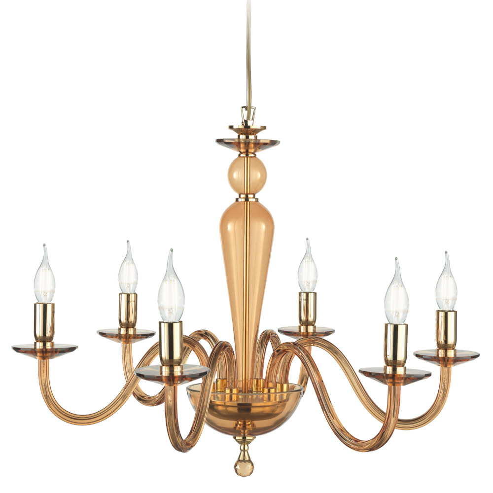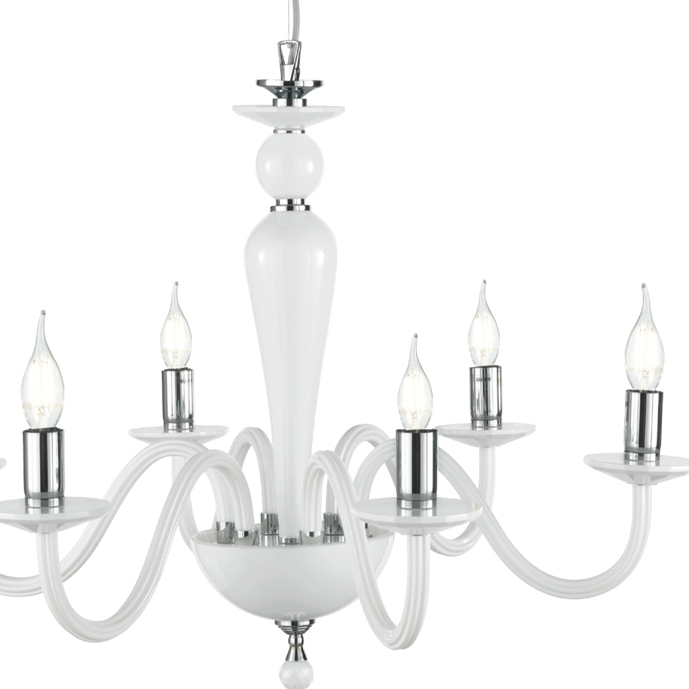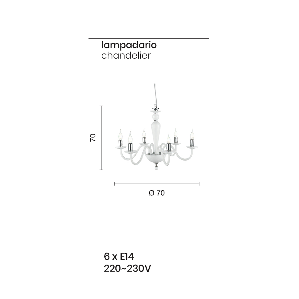 Acest candelabru cu pandantiv în stil clasic este alcătuit din 6 brațe arcuite din sticlă lucrată manual în Italia, care susțin farfuriile care găzduiesc sursele de lumină.
