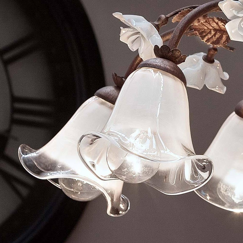Candelabru cu 8 lămpi din fier, sticlă și decor ceramică trandafiri realizat în Italia de Ferroluce.