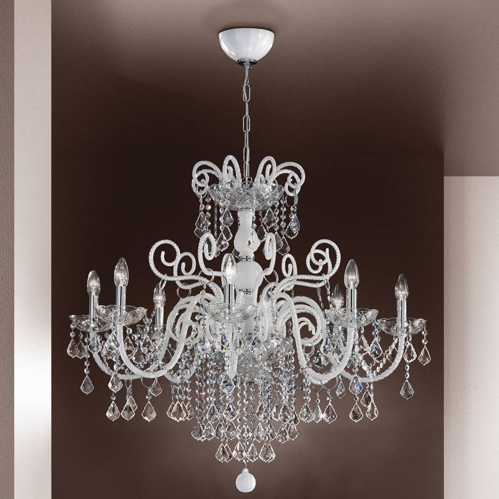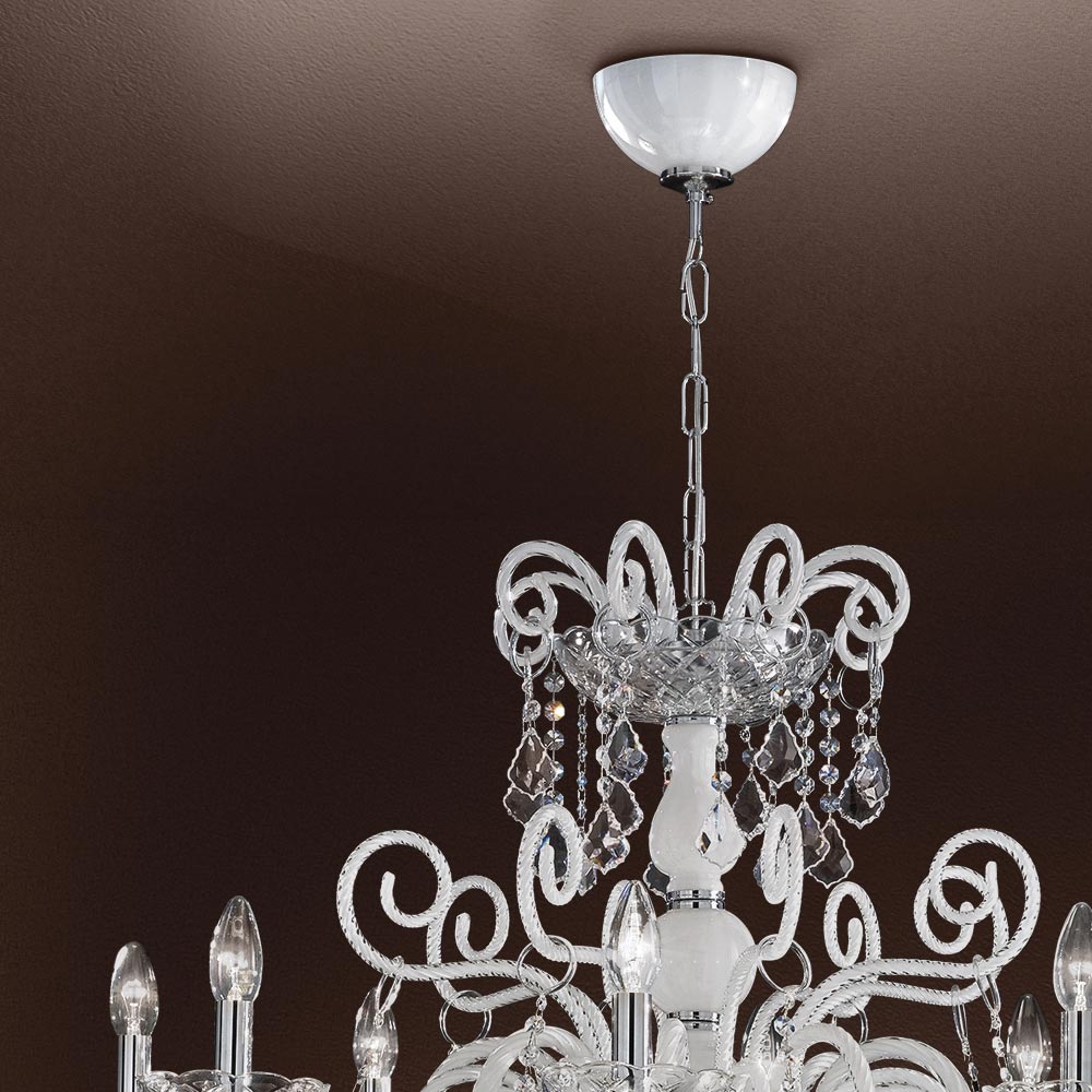 Candelabru cu 8 lumini din sticla venetiana cu finisaj alb lapte cu pandantive din plumb si metal cromat lustruit . Realizat printr-o măiestrie , acest complement se caracterizează prin minunatele brațe lucrate manual prin tehnica de răsucire care creează un rezultat exclusiv care amintește estetic de împletirea unei frânghii, dând personalitate candelabrului. O adevărată ploaie de lumină invadează structura lustrei și apoi se răspândește în mediul înconjurător prin intermediul refracției prin magia paietelor și pandantivelor de cristal cu finisaje fine, creând astfel un efect scenografic evocator și oniric capabil să încânte și să surprindă. pentru eleganța și măreția sa.