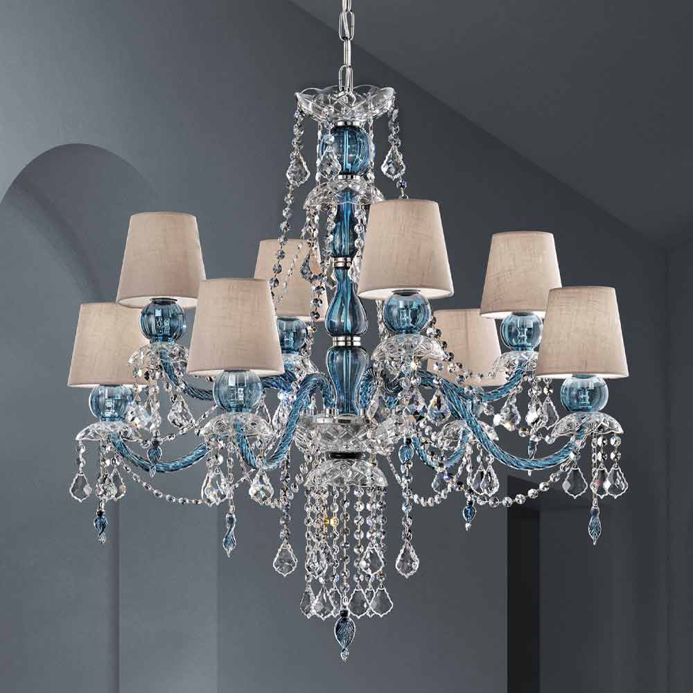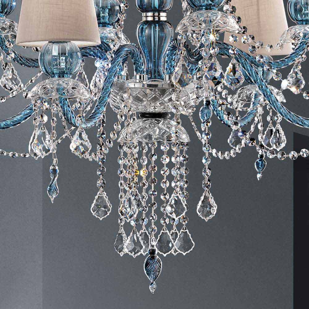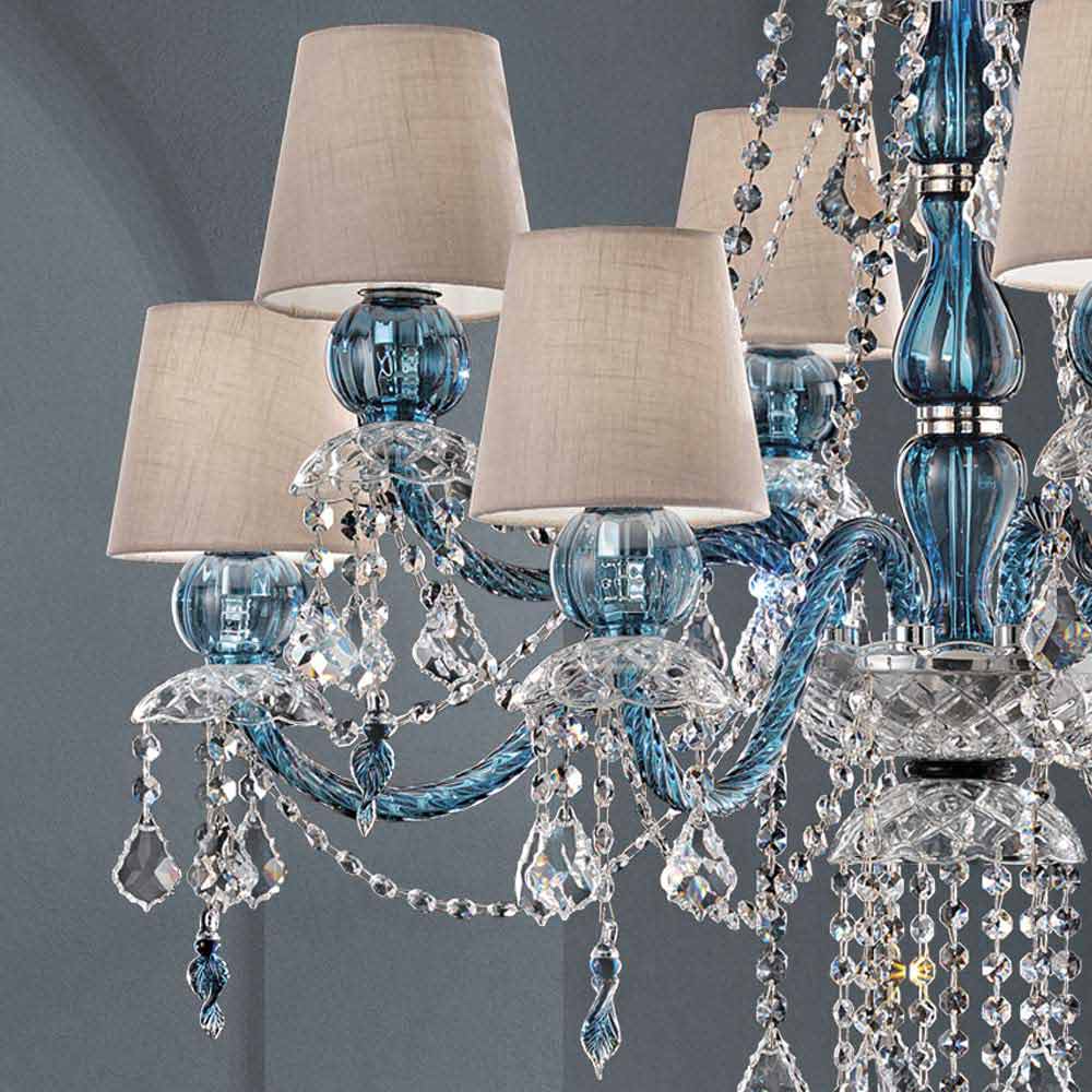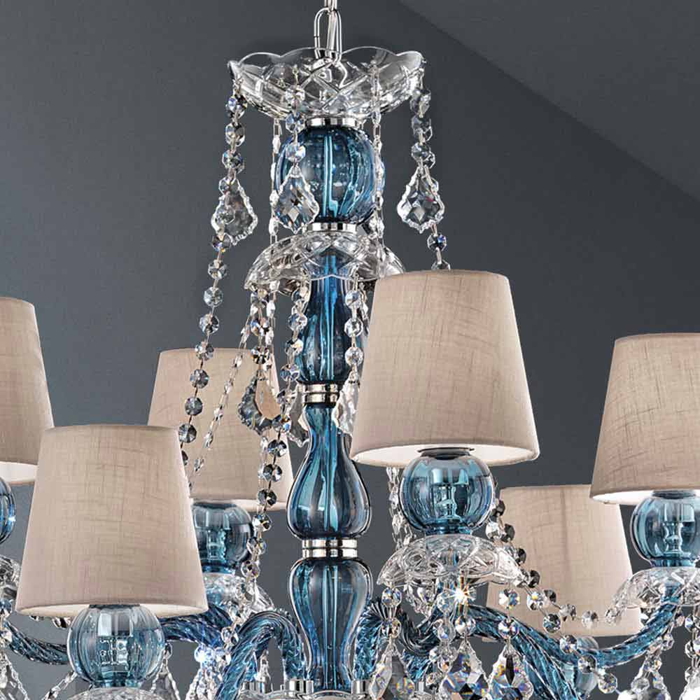 Candelabru majestuos cu 8 lumini, cu abajururi din in, structură din sticlă venețiană cu finisaj albastru , îmbogățit cu pandantive din cristal de plumb și detalii din metal cromat lustruit , fabricat manual în Italia . O piesă de mobilier cu un caracter extrem de romantic care completează camerele creând o atmosferă minunată de eleganță atemporală. În acest candelabru lumina moale converge cu dinamismul efectelor de lumină fără precedent create de pandantivele strălucitoare care, datorită refracției luminii, dau viață blițurilor colorate cu un puternic impact vizual .