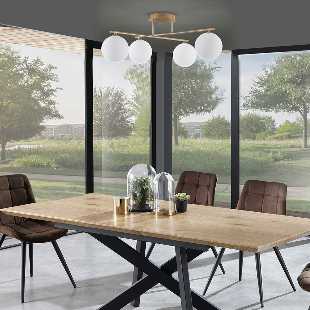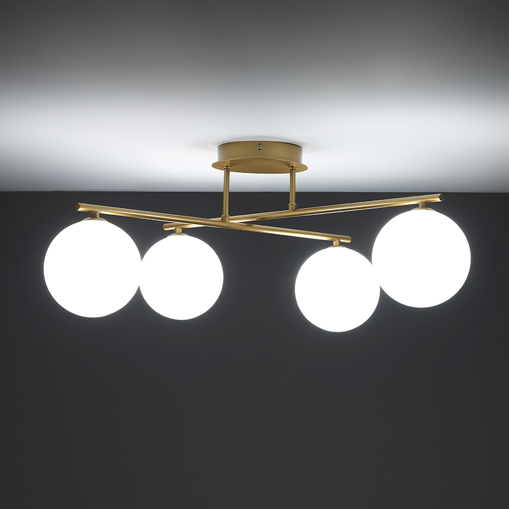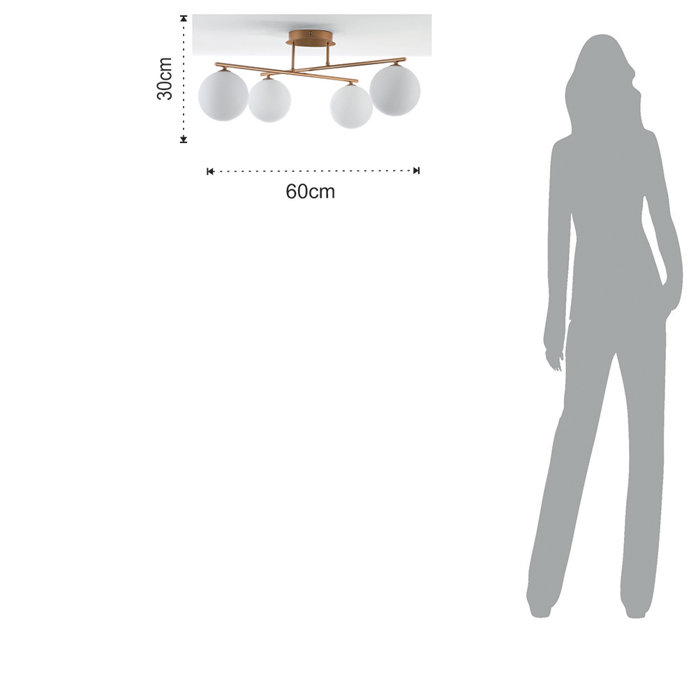 Acest candelabru reprezintă un exemplu excelent de design elegant și modern , ideal pentru a adăuga o notă de stil și rafinament oricărui mediu. Cu patru sfere de sticla opaca suspendate de o structura metalica, acest candelabru creeaza un iluminat difuz si placut, perfect pentru medii precum sala de mese, living sau chiar un hol de intrare.