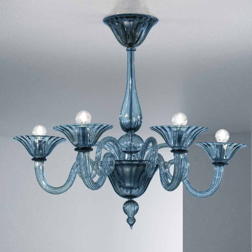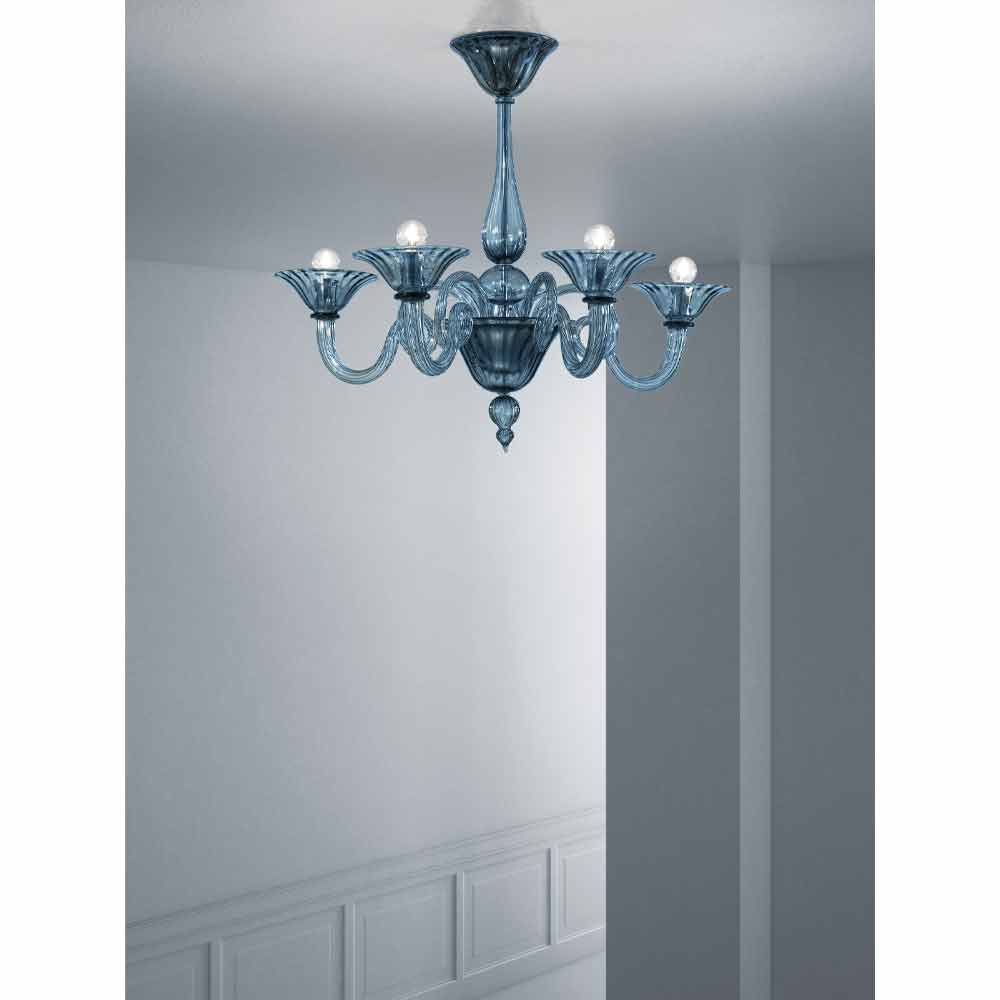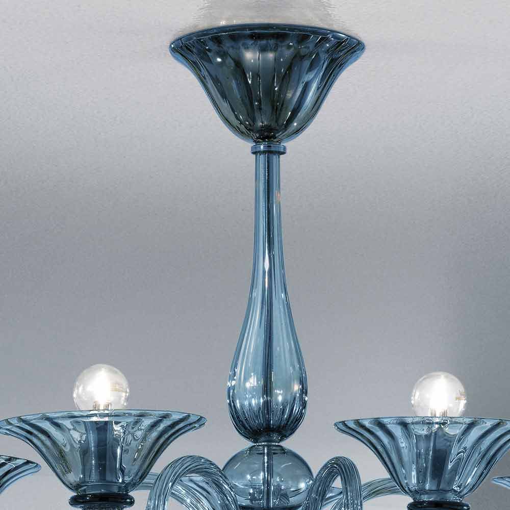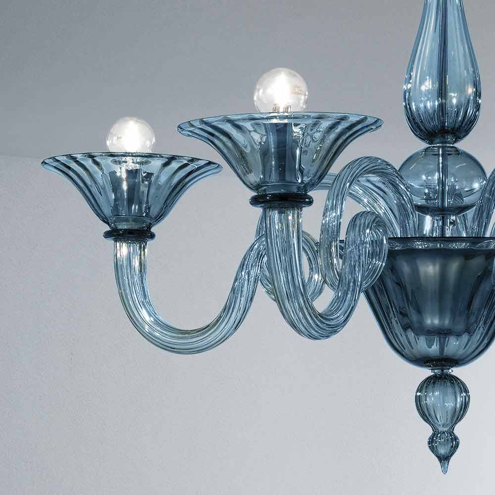 Candelabru excentric și colorat cu linii clasice fabricat manual în Italia la Veneția în sticlă albastră și metal cu finisaj cromat lustruit . Echilibrul și simetria sunt principalele caracteristici ale acestui minunat mobilier accesoriu cu caracteristici tradiționale , care este îmbogățit cu o notă modernă dată de culoarea albastră, ceea ce face , de asemenea , perfect pentru iluminarea medii casnice cu mobilier modern, creând piese splendide de contraste pentru un original și rezultat avangardist . Designul este îmbogățit de forma fără precedent a brațelor modelate în timpul procesării sticlei suflate pentru un efect creativ și fascinant .