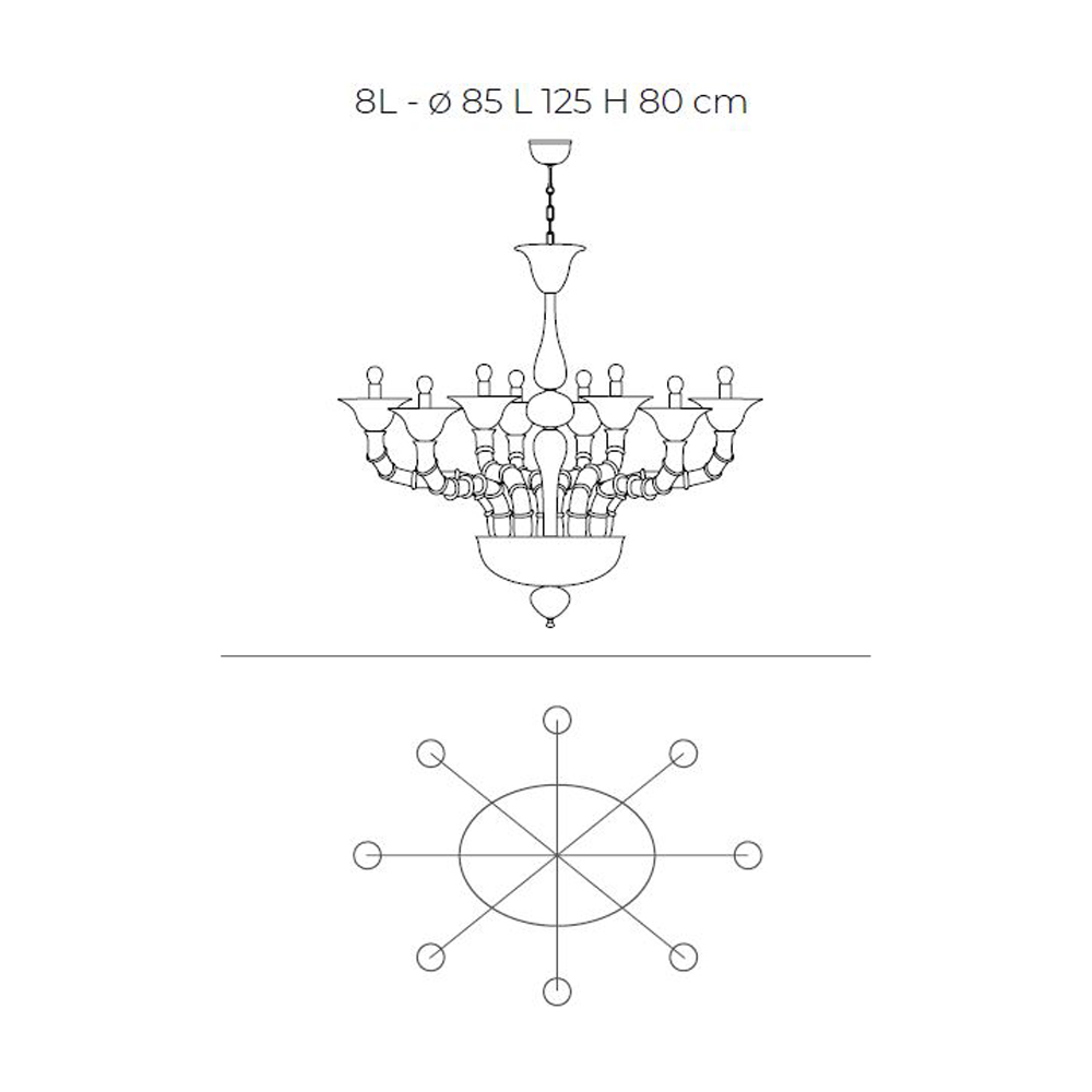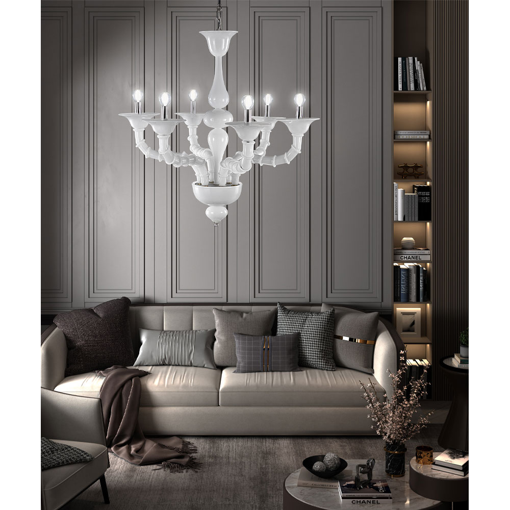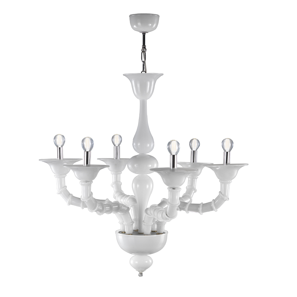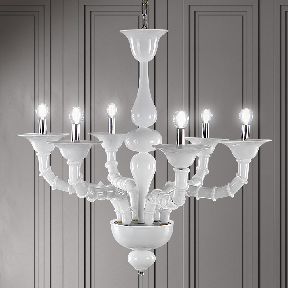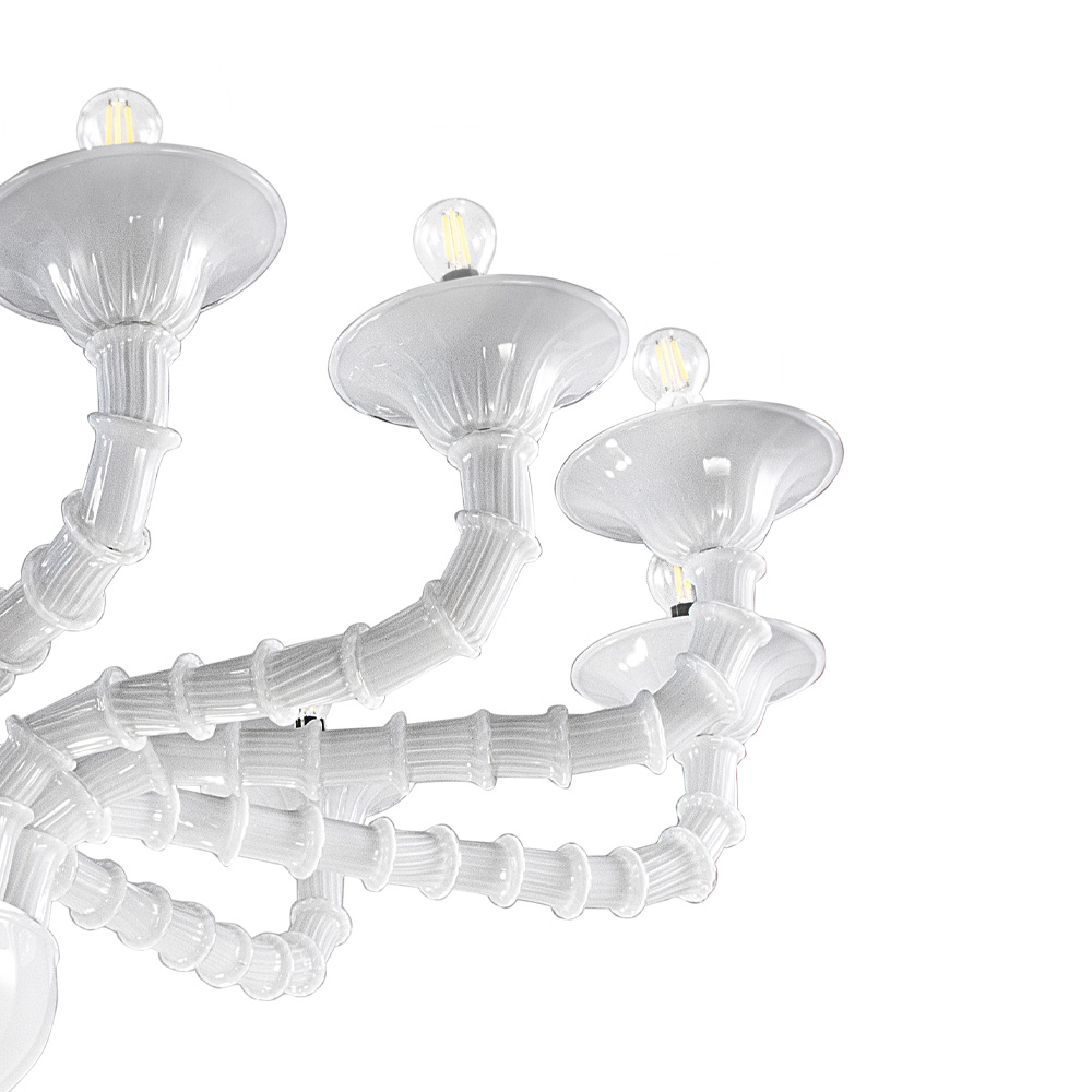 din sticlă albă Rezzonico suflată manual, concepută pentru a completa zone mari ale casei, cum ar fi sălile de mese sau camerele de zi, dând viață unui iluminat de înaltă calitate, cu o personalitate intrigantă. Lungimea brațelor este posibilă datorită tehnicii speciale definite ca „bossole” care constă în asamblarea mai multor părți de sticlă împreună, dând dovadă a