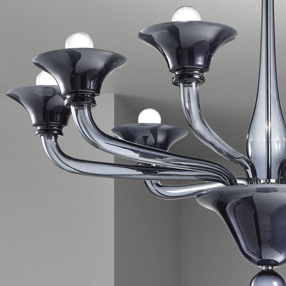 Candelabru realizat manual în Italia din sticlă Veneția cu finisaj alb-gri lapte cu detalii metalice în finisaj crom lustruit . O întâlnire fără precedent între liniile istorice și designul contemporan pentru a da viață unei piese de mobilier cu farmec și eleganță atemporale. Estetica sa se caracterizeaza printr-un volum articulat care devine dinamic si usor prin vibratia luminoasa a minunatelor suprafete din sticla suflata care alterneaza elegantele brate transparente cu cupele realizate prin folosirea tehnicii carcasei . Pentru a-i sublinia valoarea este atentia la detalii care transpare din componentele metalice cromate care permit produsului sa se adapteze la diferite gusturi si situatii de utilizare.