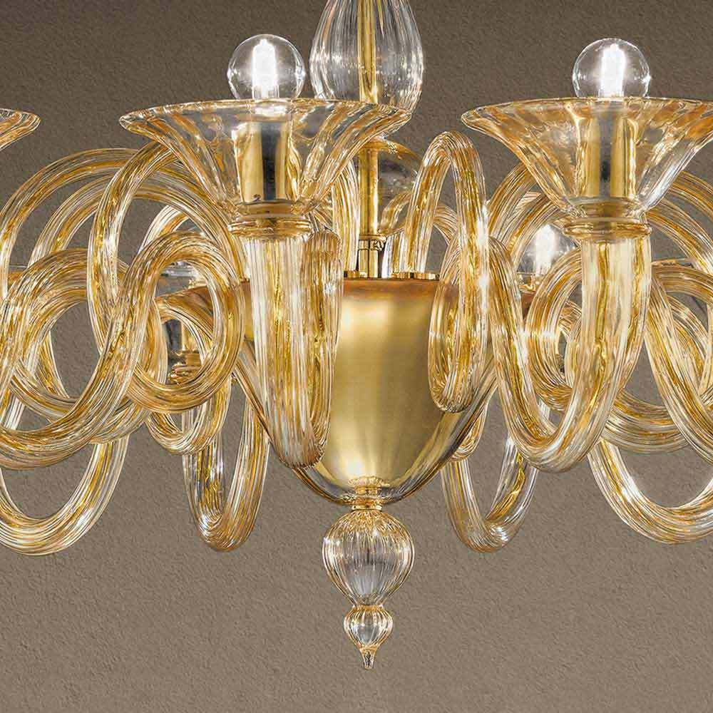 Candelabru din sticlă venețiană cu 12 lumini, finisat în chihlimbar, realizat manual în Italia.