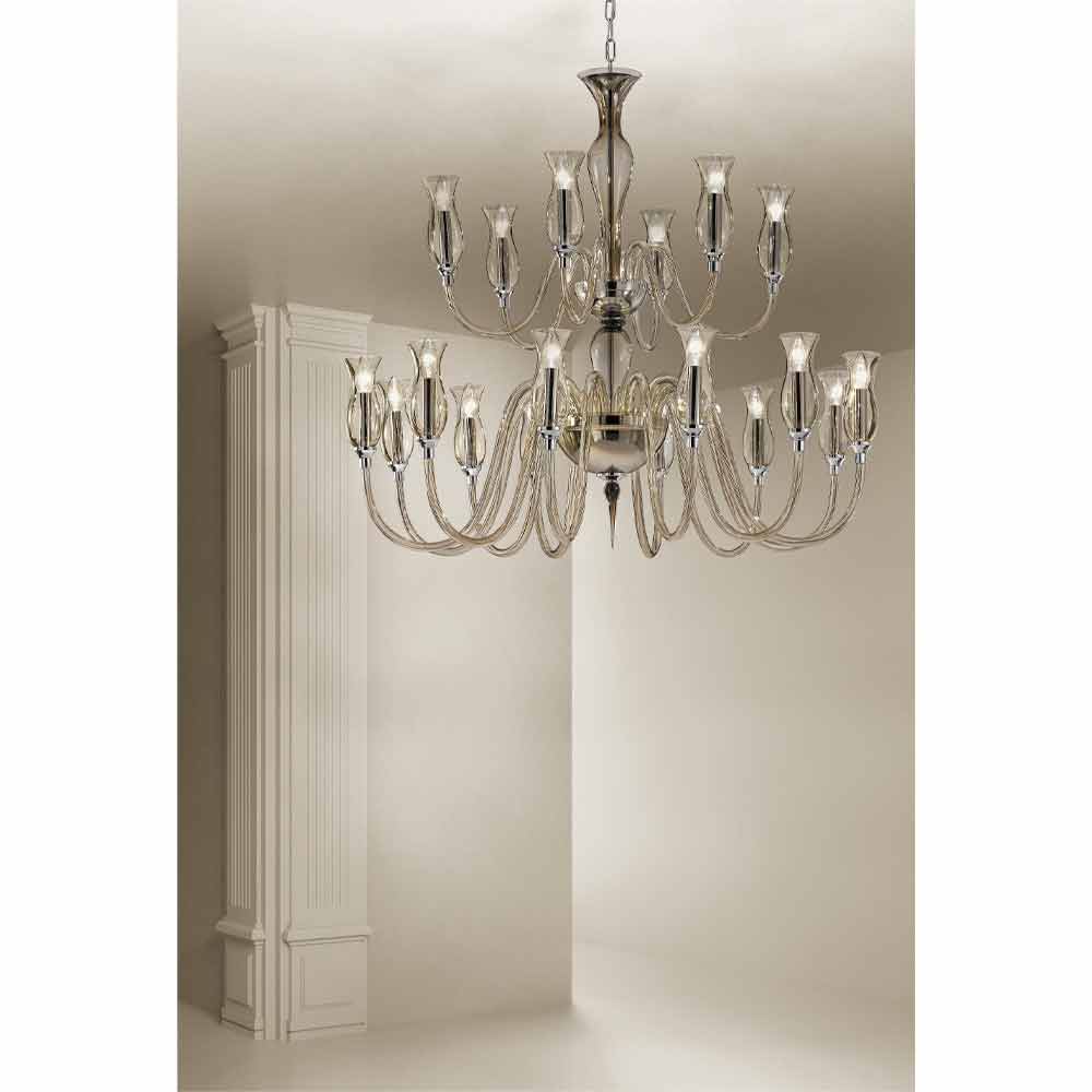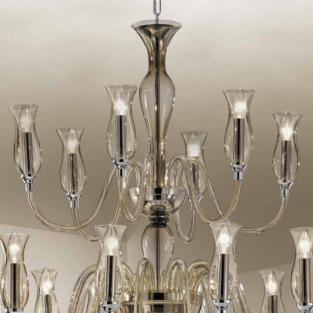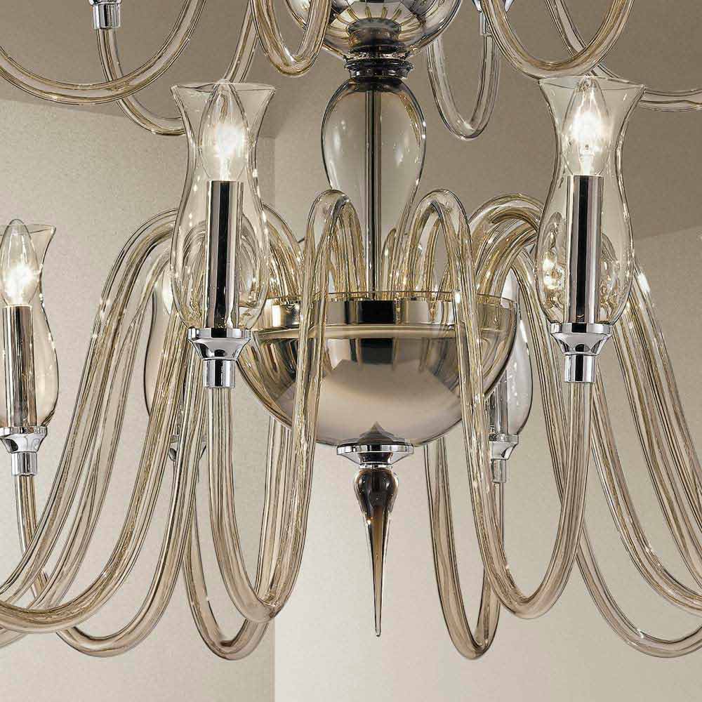 Candelabru fin și delicat de 18 lumini, fabricat manual în sticlă de la Veneția, cu finisaj afumat, cu detalii din metal cromat lustruit , fabricat în Italia . Din reinterpretarea formelor clasice și nobile de sticlă , se naște o nouă formulă de frumusețe , caracterizată prin linii sinuoase și esențiale care, redefinind formele tradiționale, dau viață unei soluții de mobilier capabile să completeze orice mediu cu personalitate. Ceea ce îmbogățește estetica este suprafața netedă a sticlei care permite luminii să alunece în direcții diferite pentru jocuri de transparențe care se combină cu efectele luminoase vibrante pentru un rezultat exclusiv cu un impact vizual puternic .