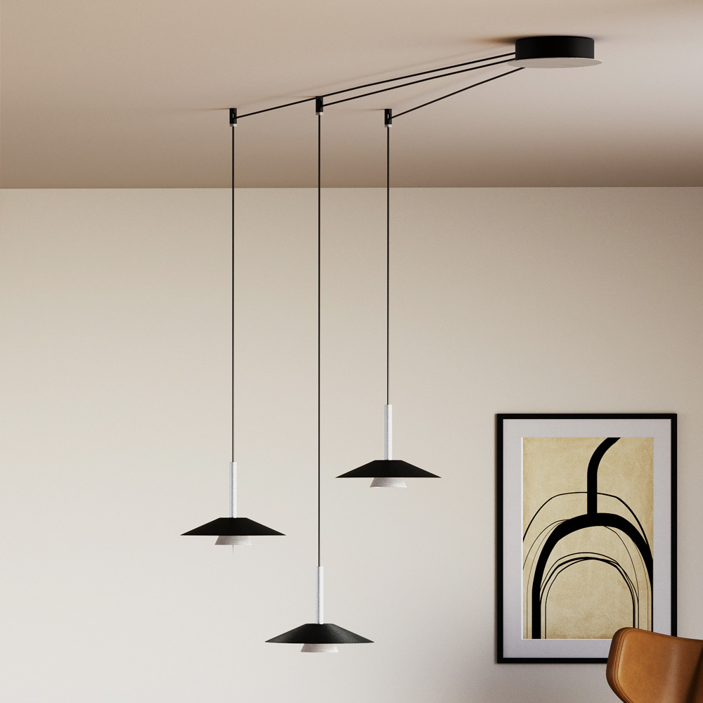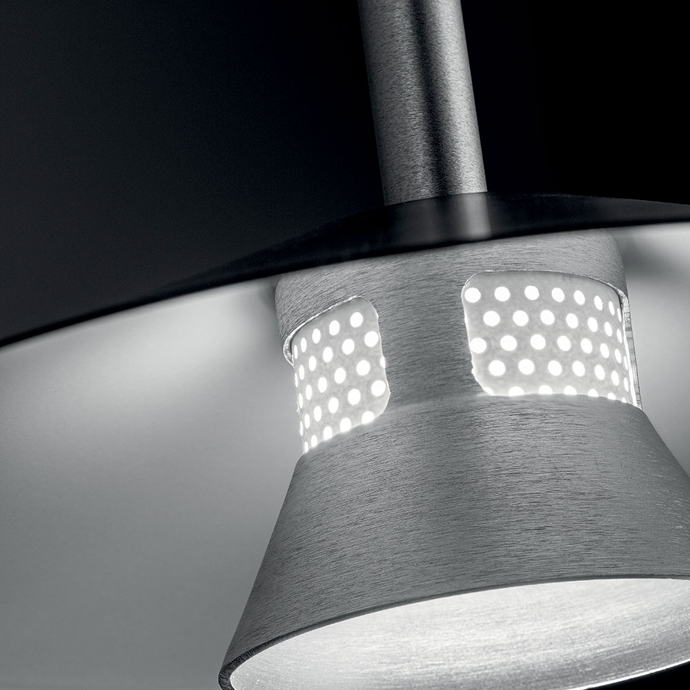 Această lampă este o fuziune perfectă între designul contemporan și eleganța industrială , concepută pentru cei care iubesc detaliile rafinate și o estetică îndrăzneață. Structura geometrică, cu un difuzor conic și un disc reflectorizant mare, creează un joc fascinant de volume și contraste , asigurând o lumină direcțională și învăluitoare .