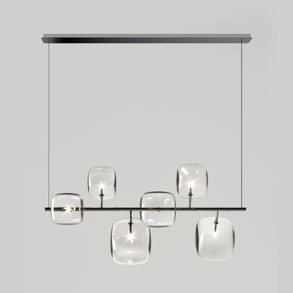 Lampă suspendată orizontală cu structură metalică și 6 structuri cubice și rotunjite din sticlă Pyrex suflată transparentă cu 1 bec LED G4 3000K reglabil în interior fiecare.