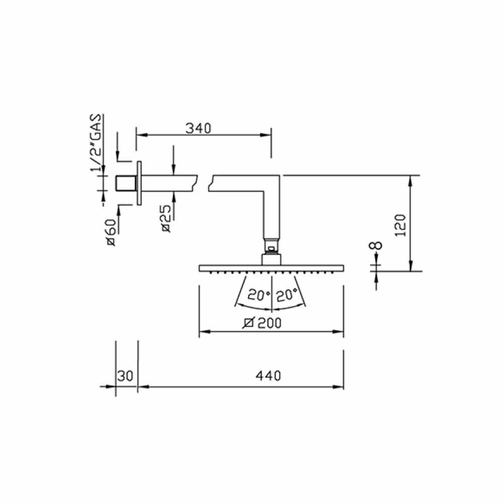 Cap de duș pătrat, cu un singur jet, montat pe perete, din oțel și alamă Fabricat în Italia.