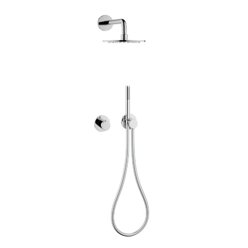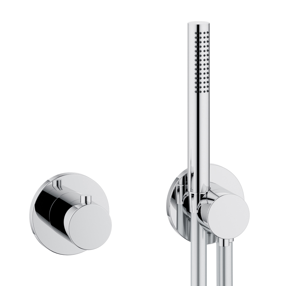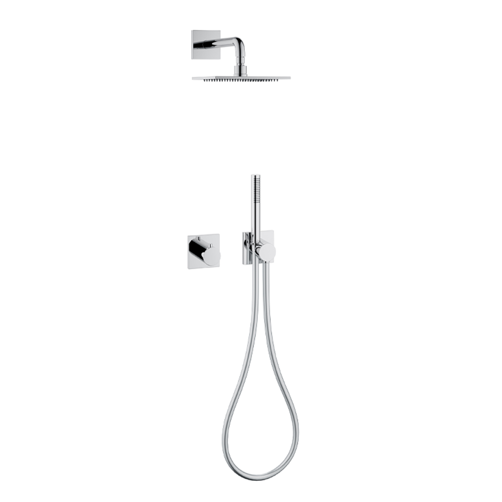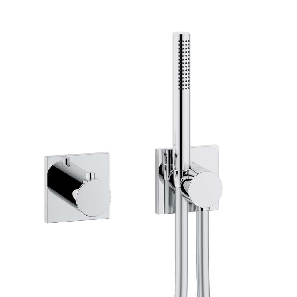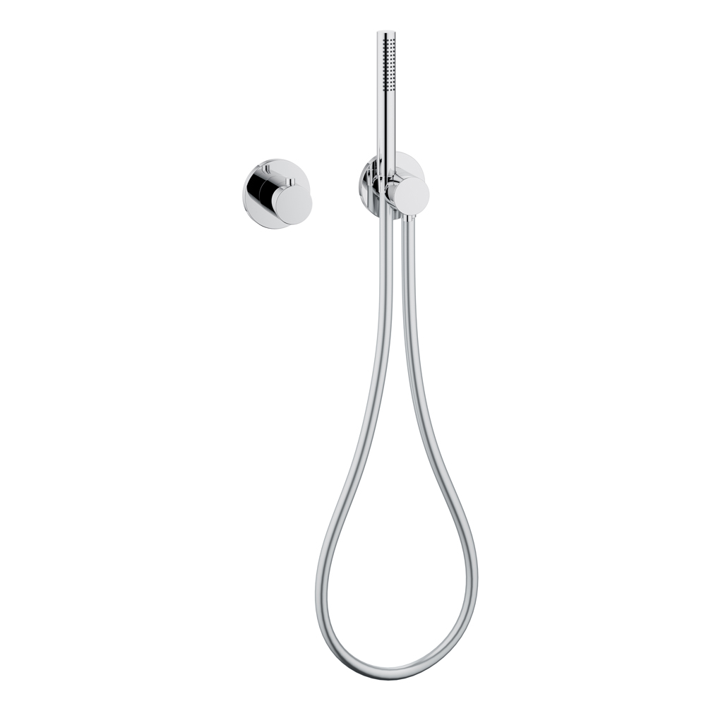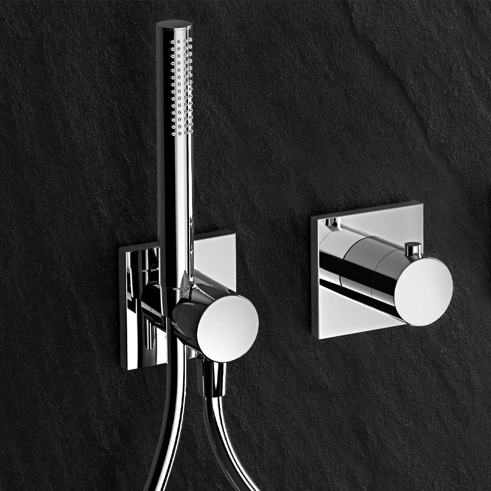 - Supapă de oprire cu două căi ascunse și deviator cu racord de furtun flexibil și suport de duș pe perete