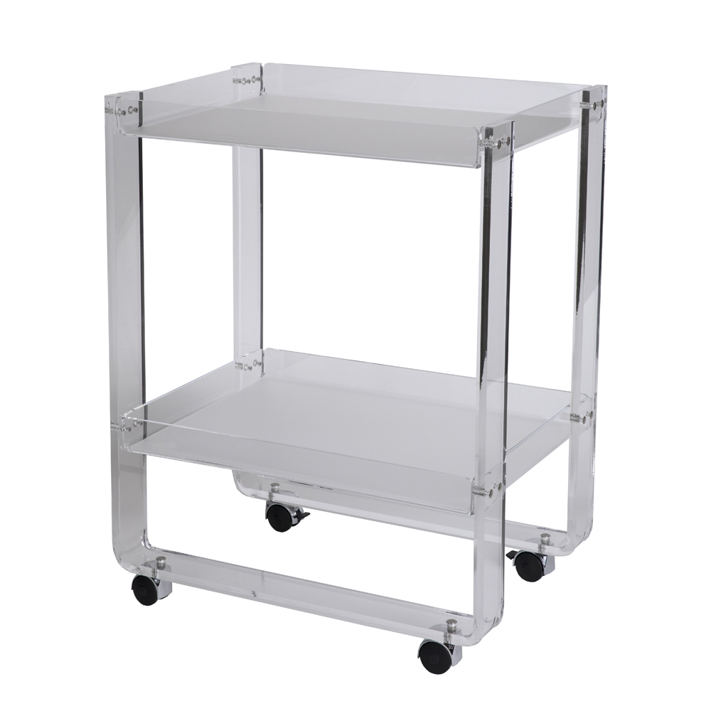 Acest carucior pentru living este realizat integral din cristal acrilic transparent cu grosimea de 15 mm cu 2 rafturi de 5 mm si roti pivotante.