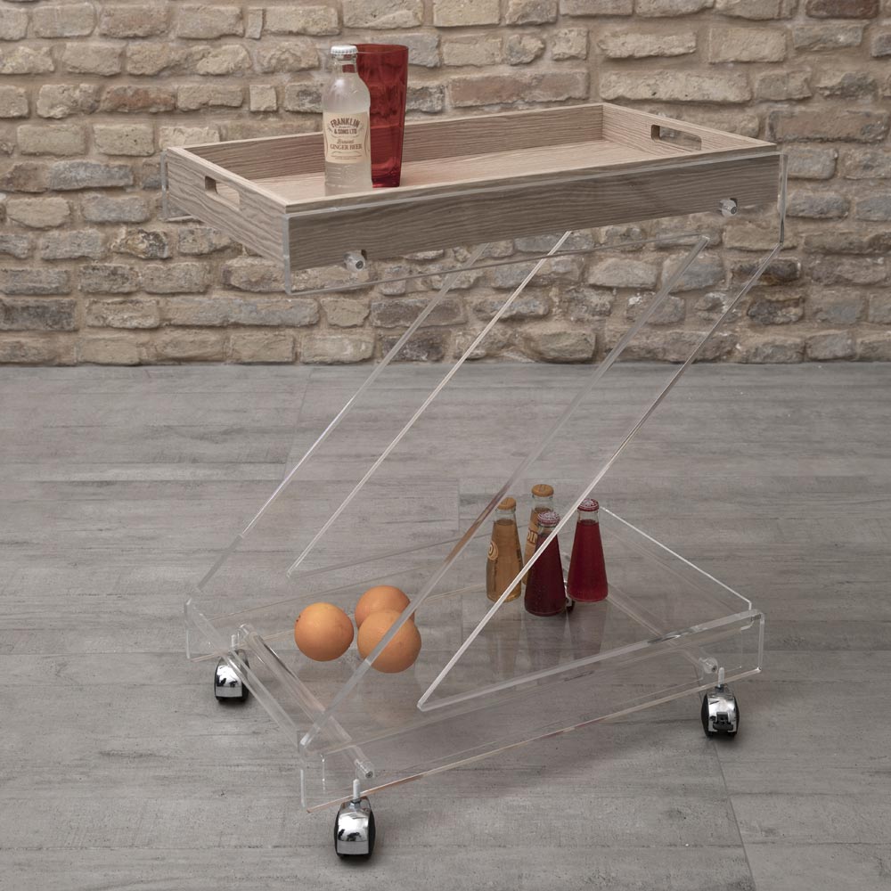 Cărucior din cristal acrilic transparent cu roți și tavă cu 2 finisaje, fabricat în Italia.
