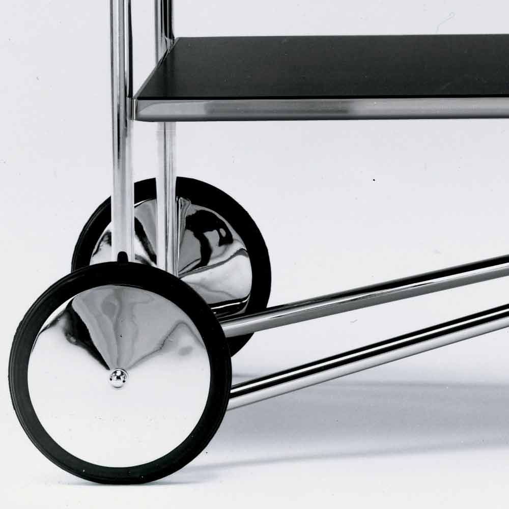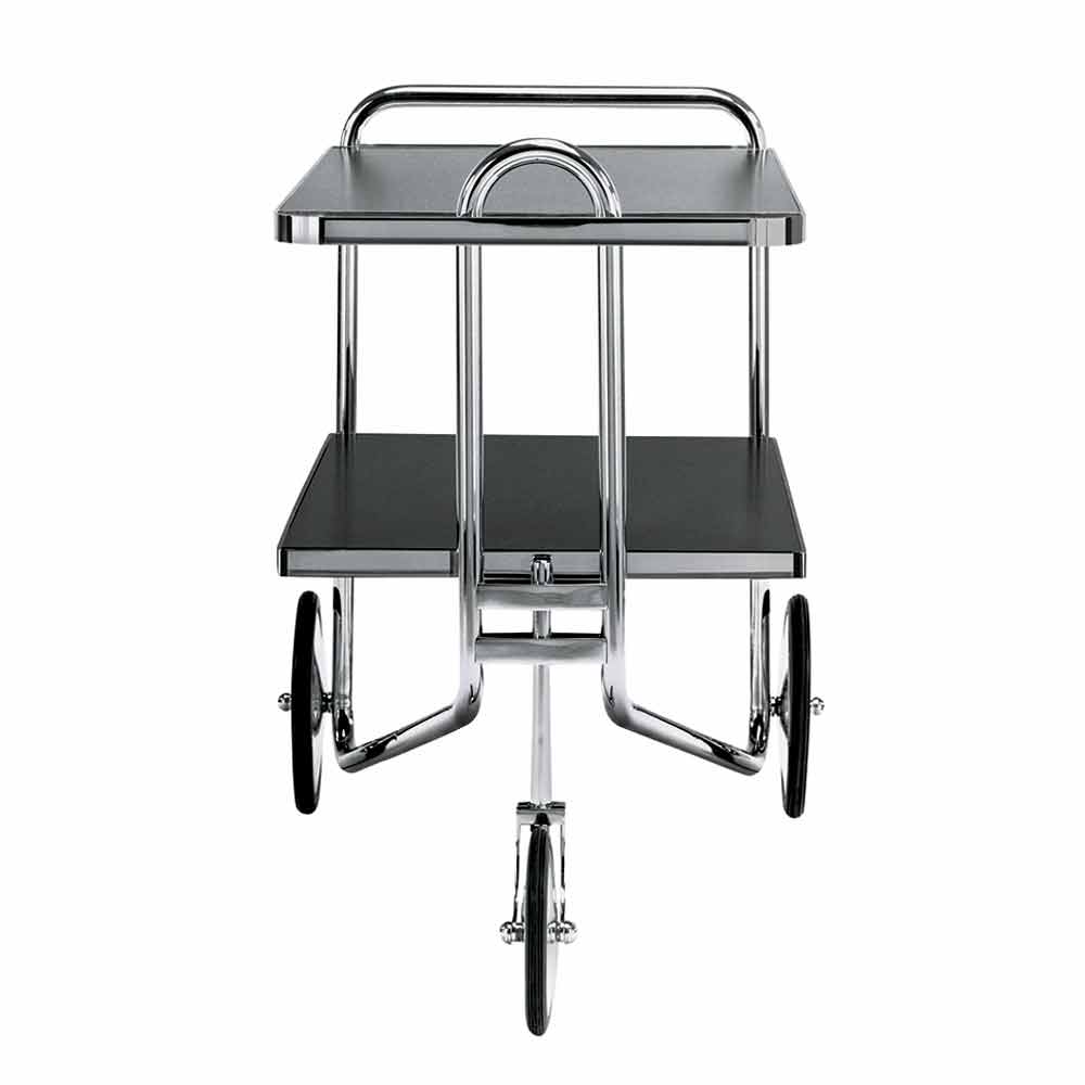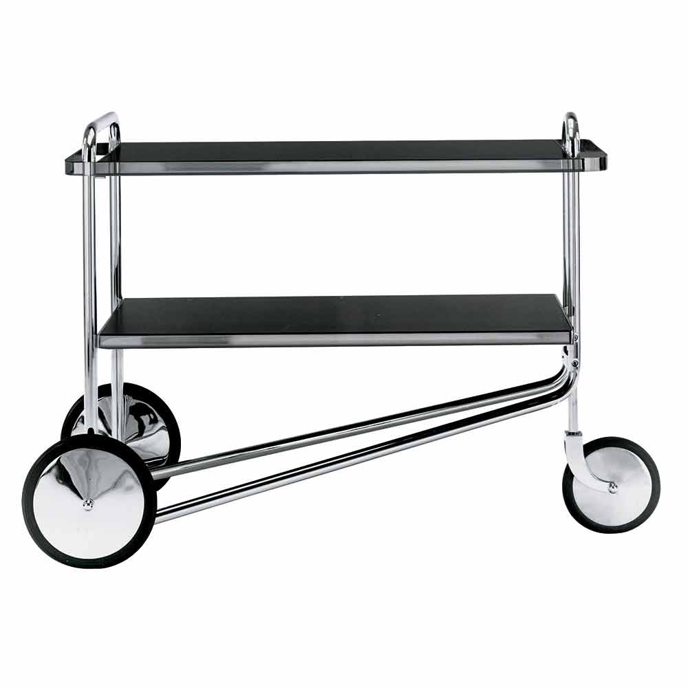 Cărucior alimentar cu structură din oțel cromat echipat cu 3 roți și două rafturi din laminat negru. Practicitatea și designul se reunesc pentru a da viață unei piese de mobilier extrem de funcționale și auxiliare în mediul acasă a cărei utilizare este facilitată și mai mult de roțile practice care permit mutarea ei rapidă și ușoară. În plus față de o latură pur funcțională, acest cărucior alimentar oferă o estetică inovatoare și rafinată ideală pentru cei care doresc să-și completeze mobilierul cu o notă de stil nou .