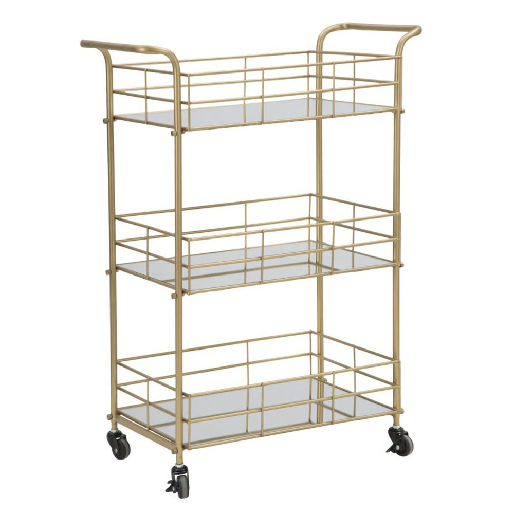 Cărucior cu alimente din fier aurit, cu rafturi cu oglinzi și roți.