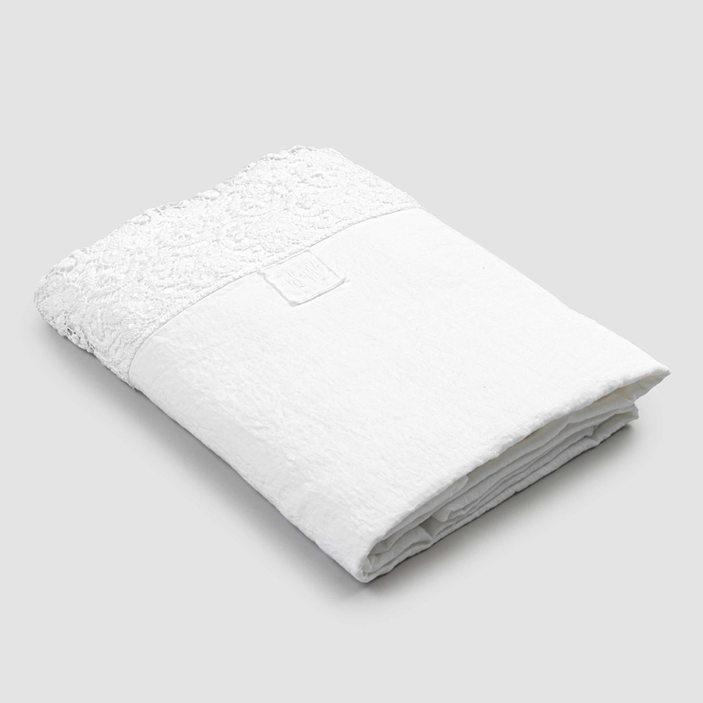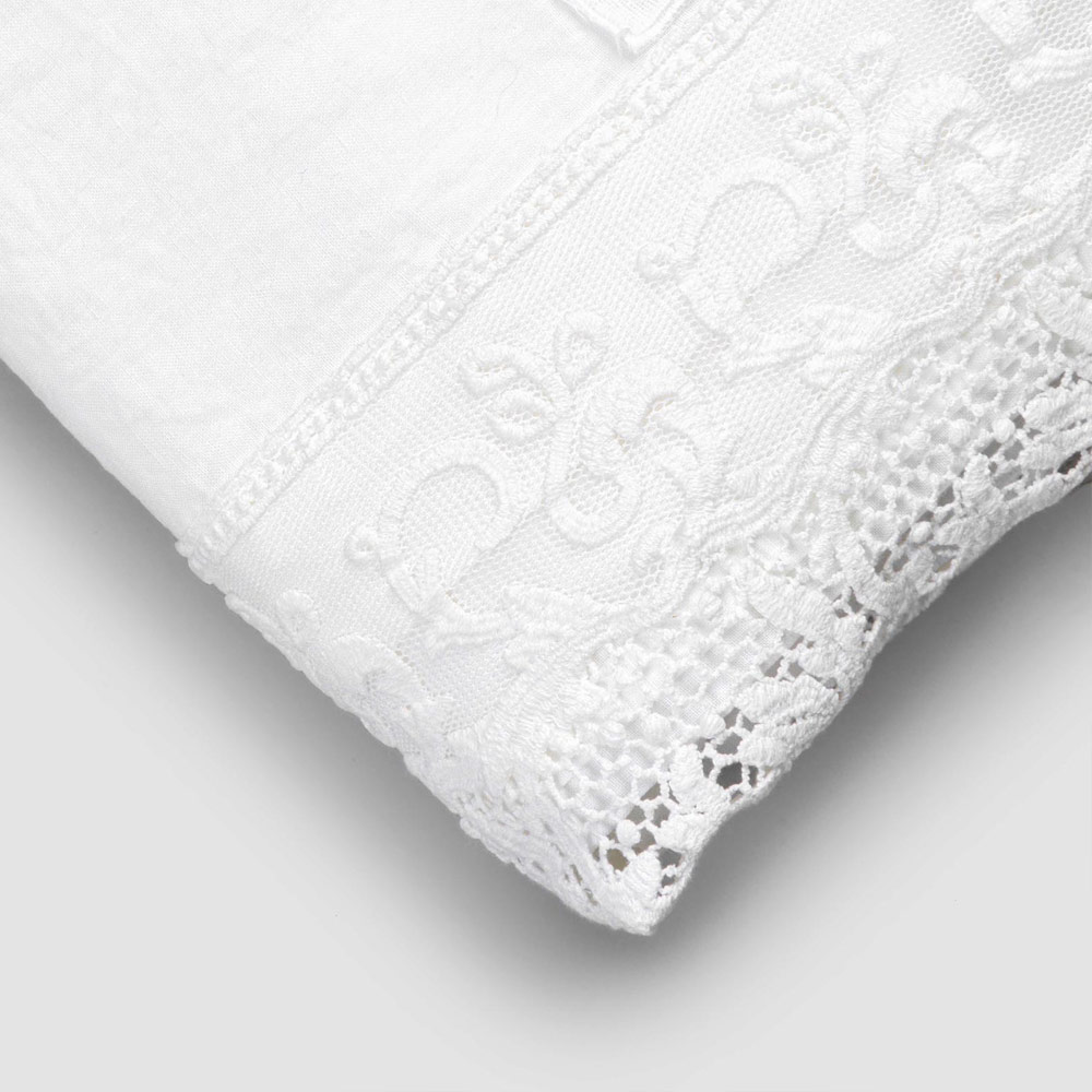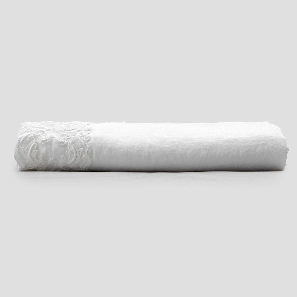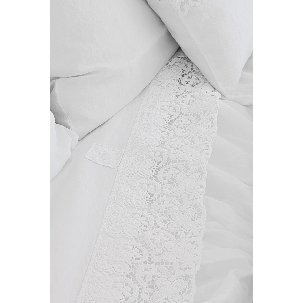 Cearșaf pentru pat dublu în lenjerie albă pură cu diferite tipuri de dantelă, măiestrie de design de lux realizată în Italia.