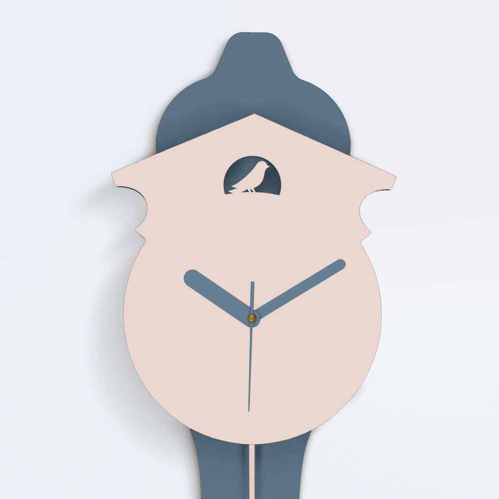 Perete de ceas cu pendul gri și roz, design modern din lemn tăiat cu laser, realizat în Italia.