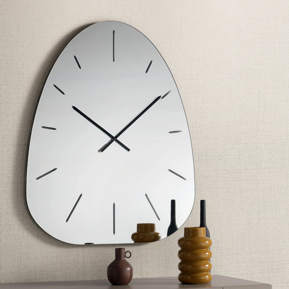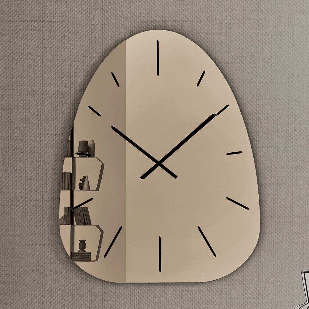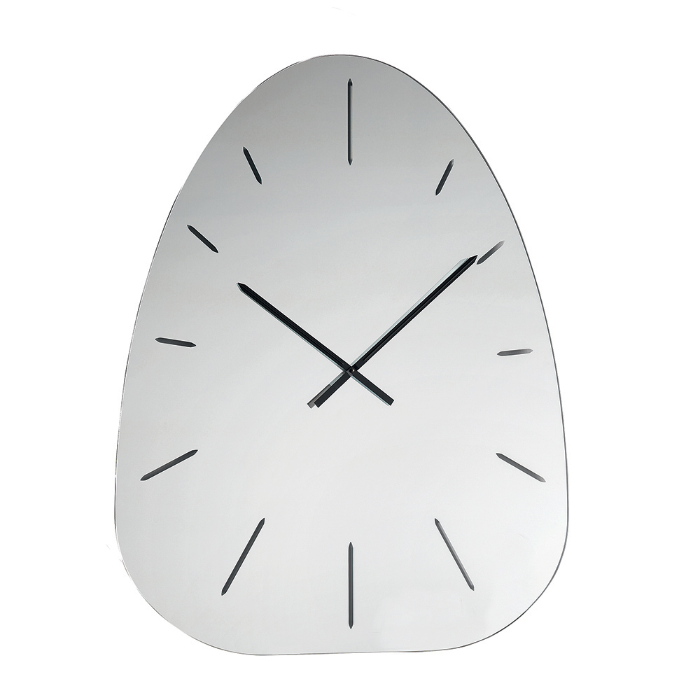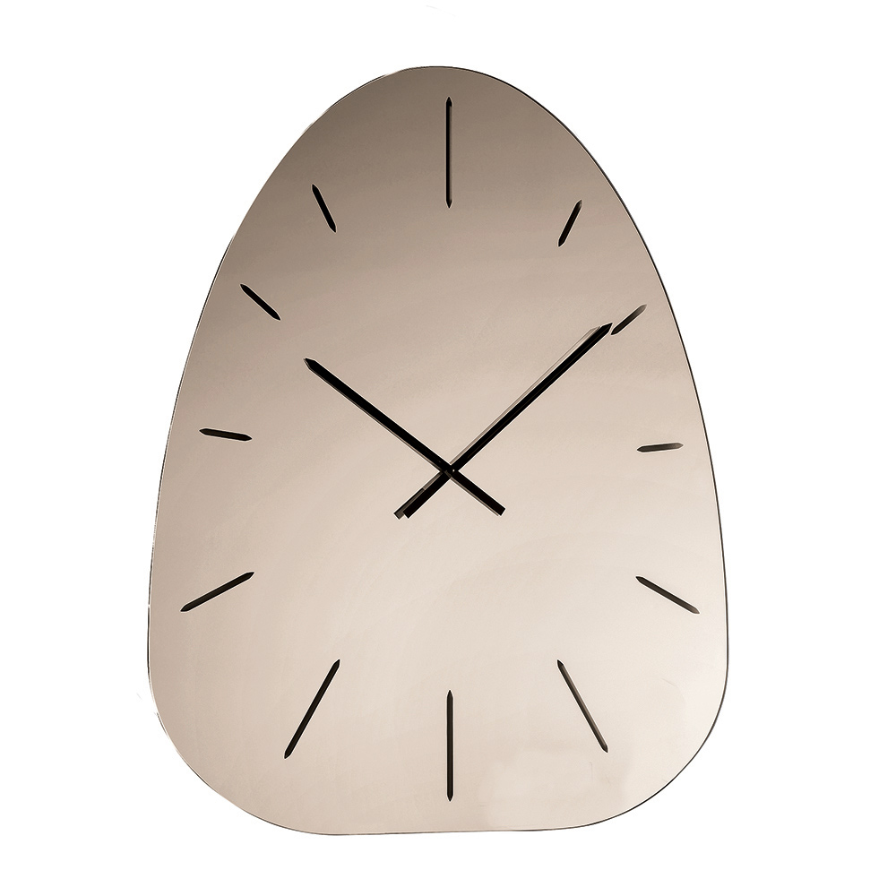 Fabricat din sticlă oglindită , ceasul se remarcă prin numerele gravate cu laser care ies discret din suprafața reflectorizantă, creând un joc rafinat de lumină și profunzime ce variază pe parcursul zilei.