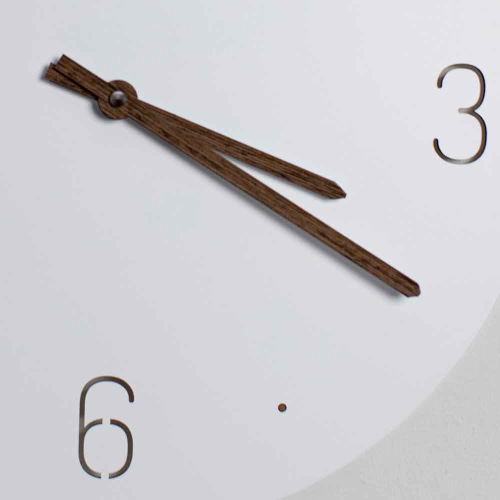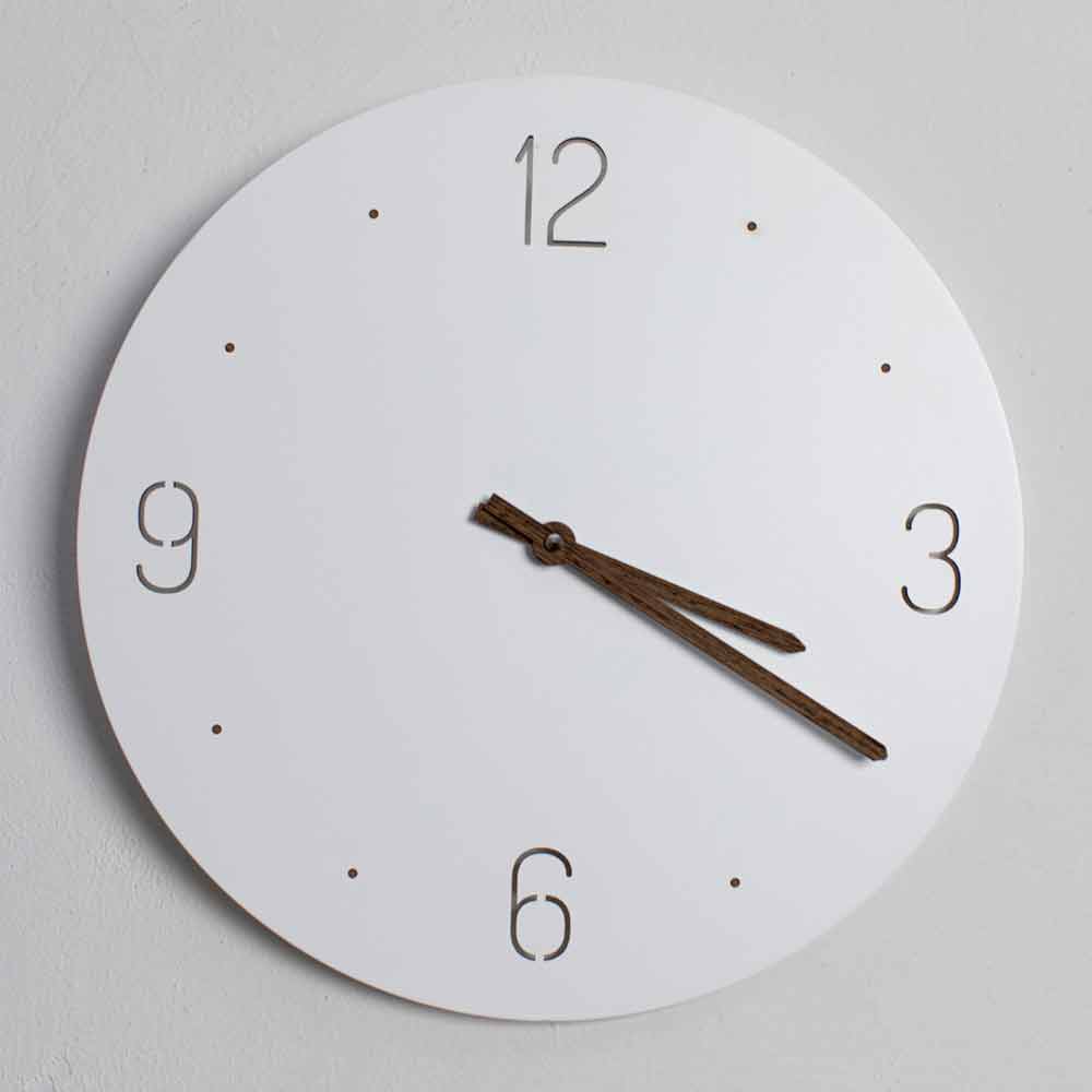 Ceas de perete design rotund și de bază din lemn lăcuit alb și tăiat cu laser, realizat în Italia.